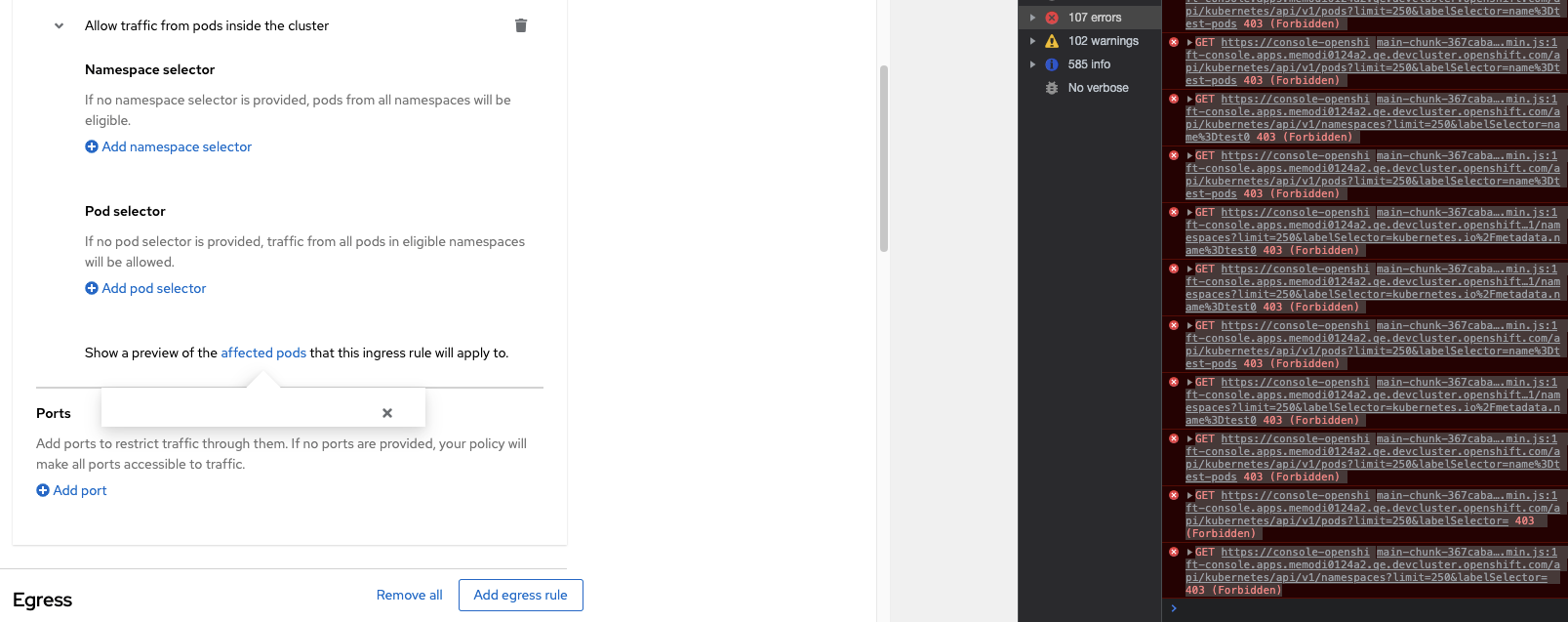 3. When clicked on the "affected pods", the pop up shows empty and the console shows 403 (Forbidden), because user doesn't have privileges to see pods of projects that in rest of the cluster.