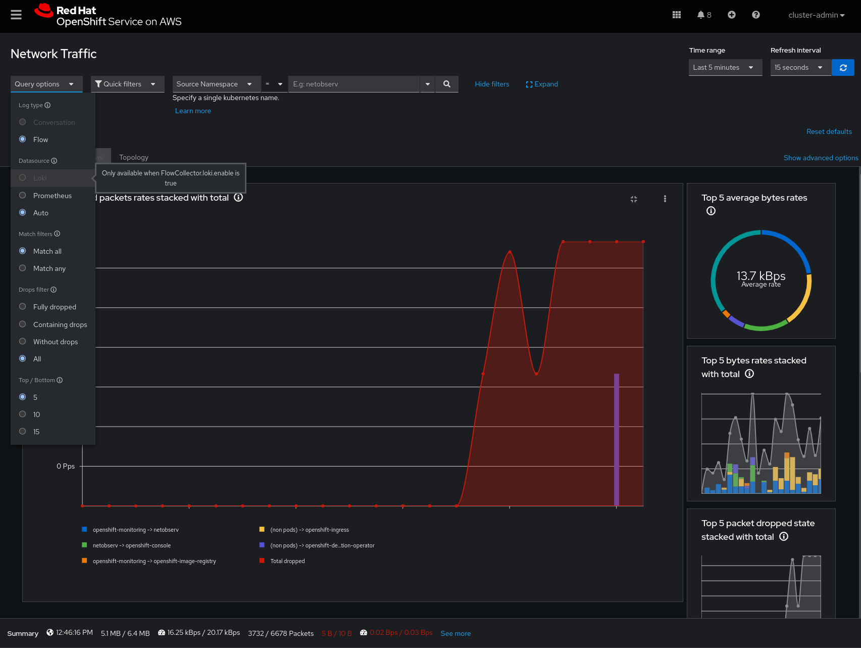 Can't build query: this request requires any of the following metric(s) to be enabled: workload_ingress_packets_total, workload_egress_packets_total. Metrics can be configured in the FlowCollector resource via 'spec.processor.metrics.includeList'. Alternatively, you may also install and enable Loki