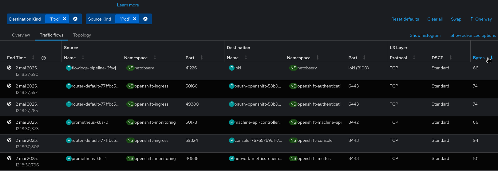 A bug was preventing users to sort flows by Bytes or Packets in the Traffic flows view of the Console plugin. It is now fixed, allowing to sort flows as expected.