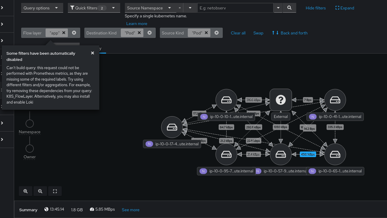 Running in Loki-less mode, clicking Node or Network (UDN enabled) results in an error message that is impossible to clear. Things attempted: - Go back to network summary view - Reload browser page - log out/in to console Only a cache clear helps. I would expect to be able to recover a usable network observability view without the cache clear. This happens on Chrome and FF Can't build query: this request could not be performed with Prometheus metrics, as they are missing some of the required labels. Try using different filters and/or aggregations. For example, try removing these dependencies from your query: SrcK8S_HostName, DstK8S_HostName. Alternatively, you may also install and enable Loki Dev tools doesn't show much. Before the bad click there are repeated periodic messages with: "netflow-traffic.ts:100 ProgressStep: The titleId and id properties are required to make this component accessible, and one or both of these properties are missing." After the bad click, there is: