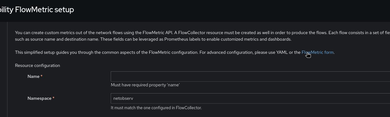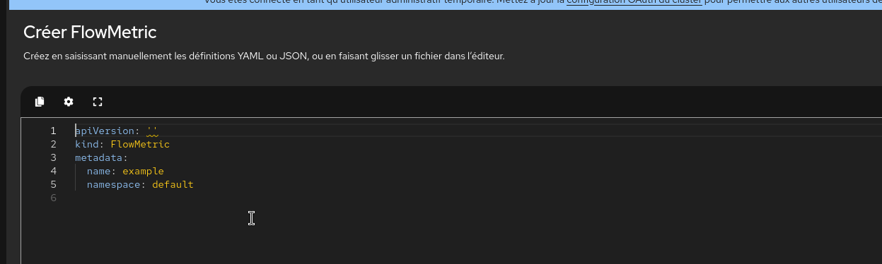 The link to create a FlowMetric form leads to a page with just the YAML editor (not the form), and with wrong defaults (e.g. apiVersion is empty)