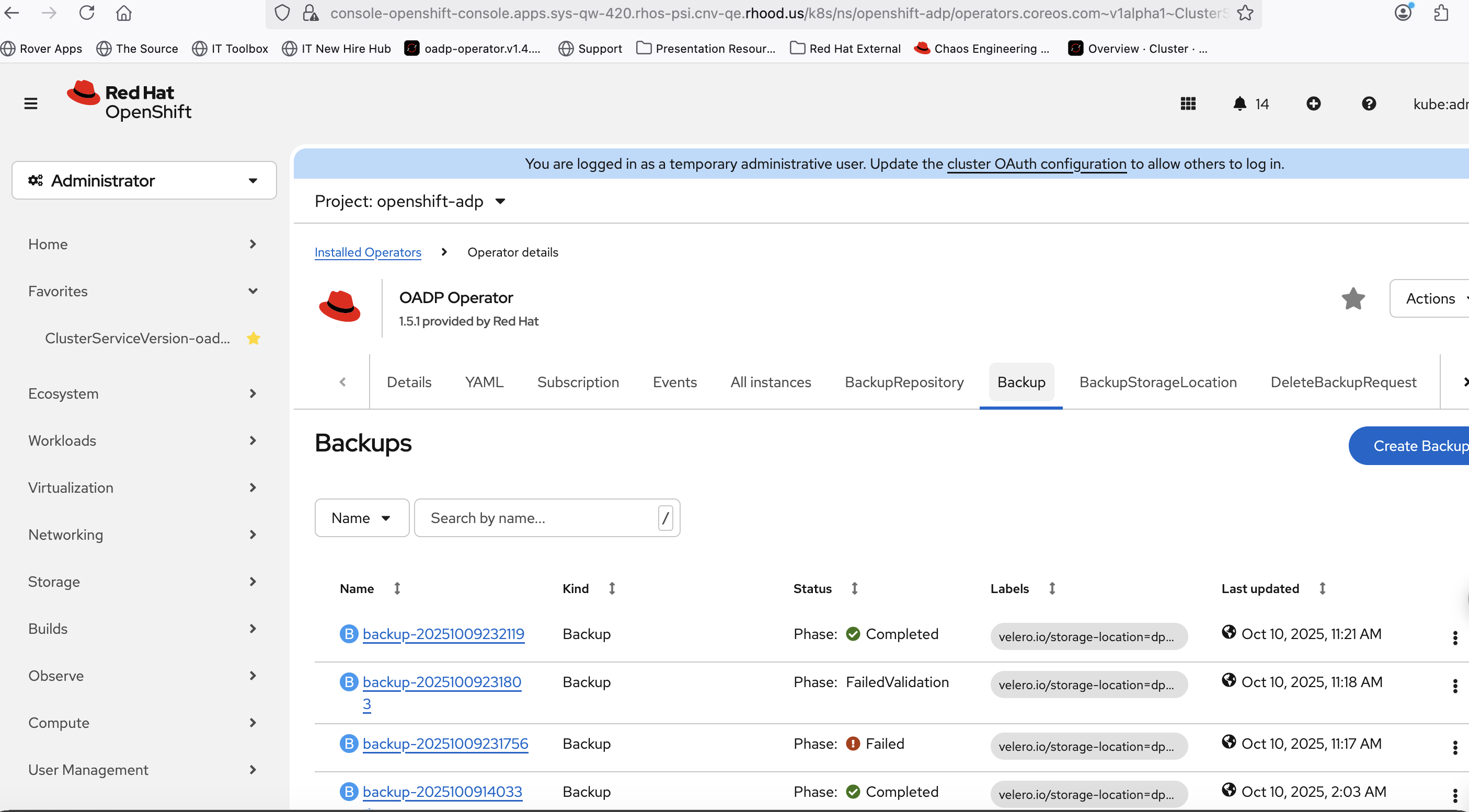 oadp-operator.v1.5.1   OADP Operator   1.5.1     oadp-operator.v1.5.0   Succeeded