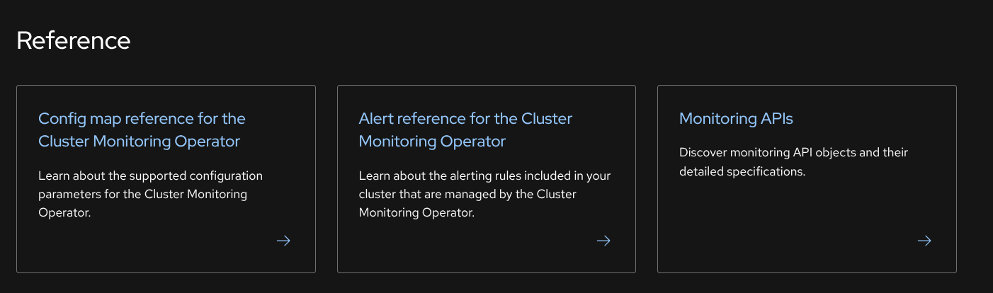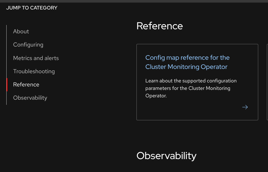 And when the user clicks on "Monitoring APIs", they are redirected to the OCP documentation where the API reference currently stays due to automation reasons that we do not want to change before migration. However, that could make it difficult to locate the API reference, if the used does not see the title on the main page (search would not give any results for montioring API documentation either, only if the used searched in OCP docs)