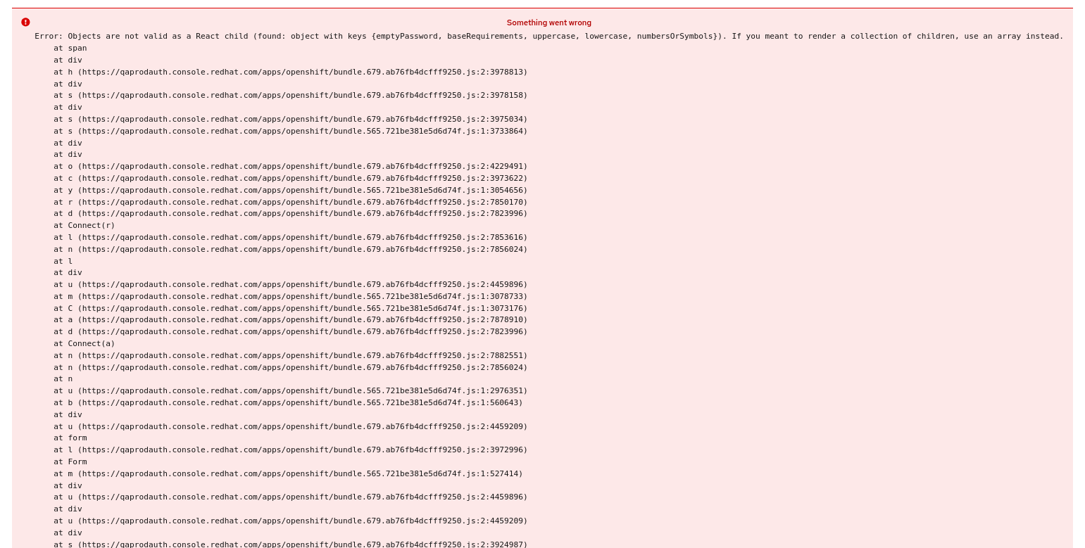 helpers.js:88  Uncaught Error: Objects are not valid as a React child (found: object with keys {emptyPassword, baseRequirements, uppercase, lowercase, numbersOrSymbols}). If you meant to render a collection of children, use an array instead.