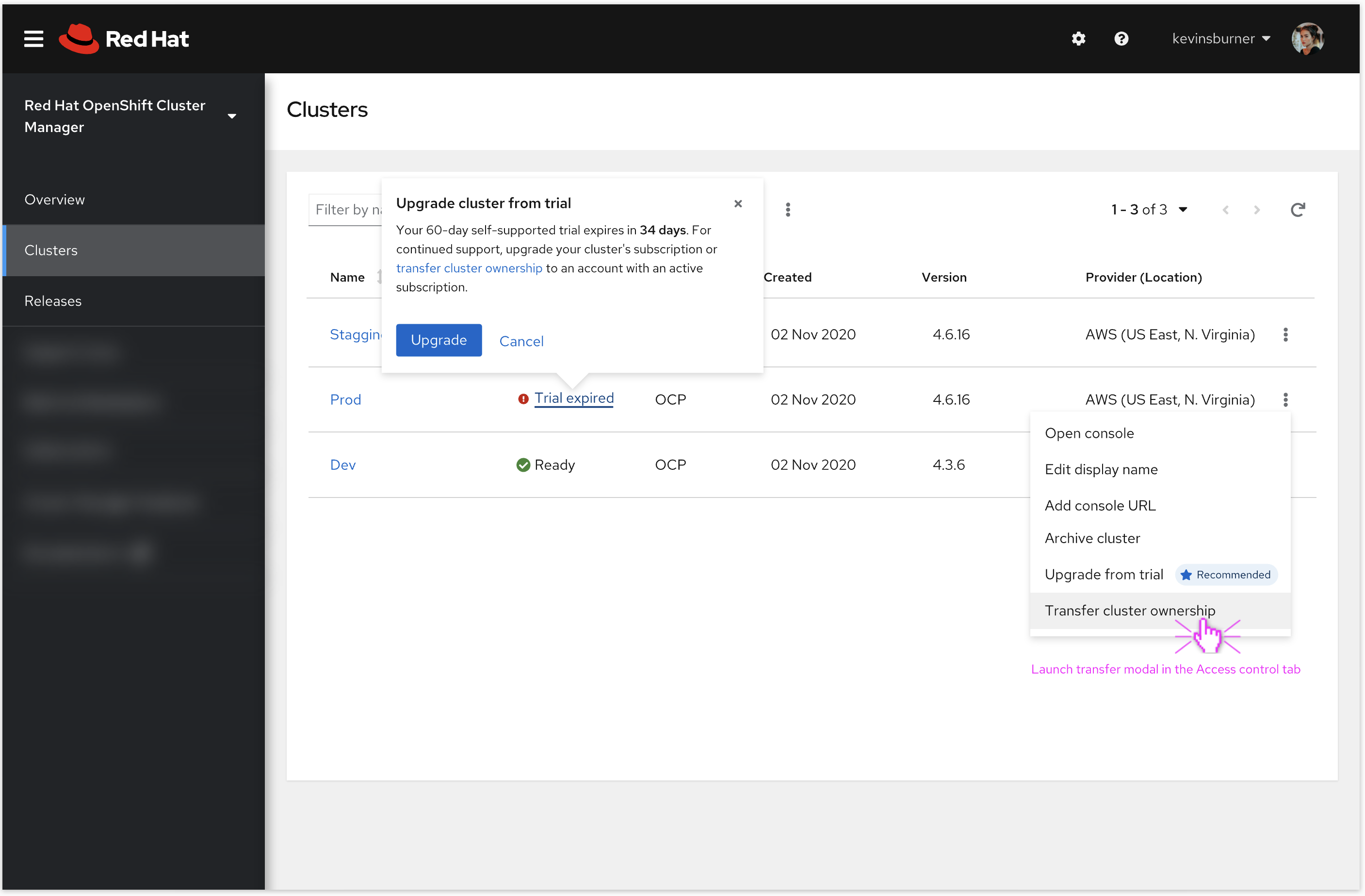 Brings user to the "Transfer ownership" tab on the cluster details page with the modal open