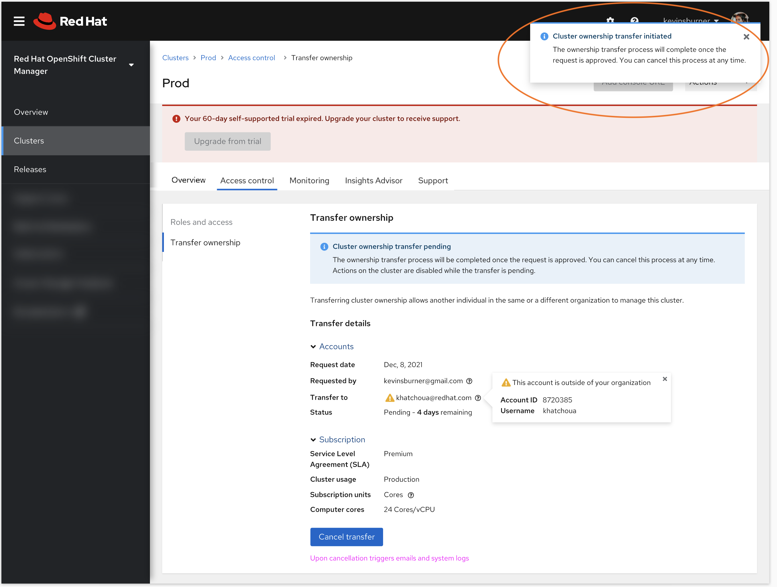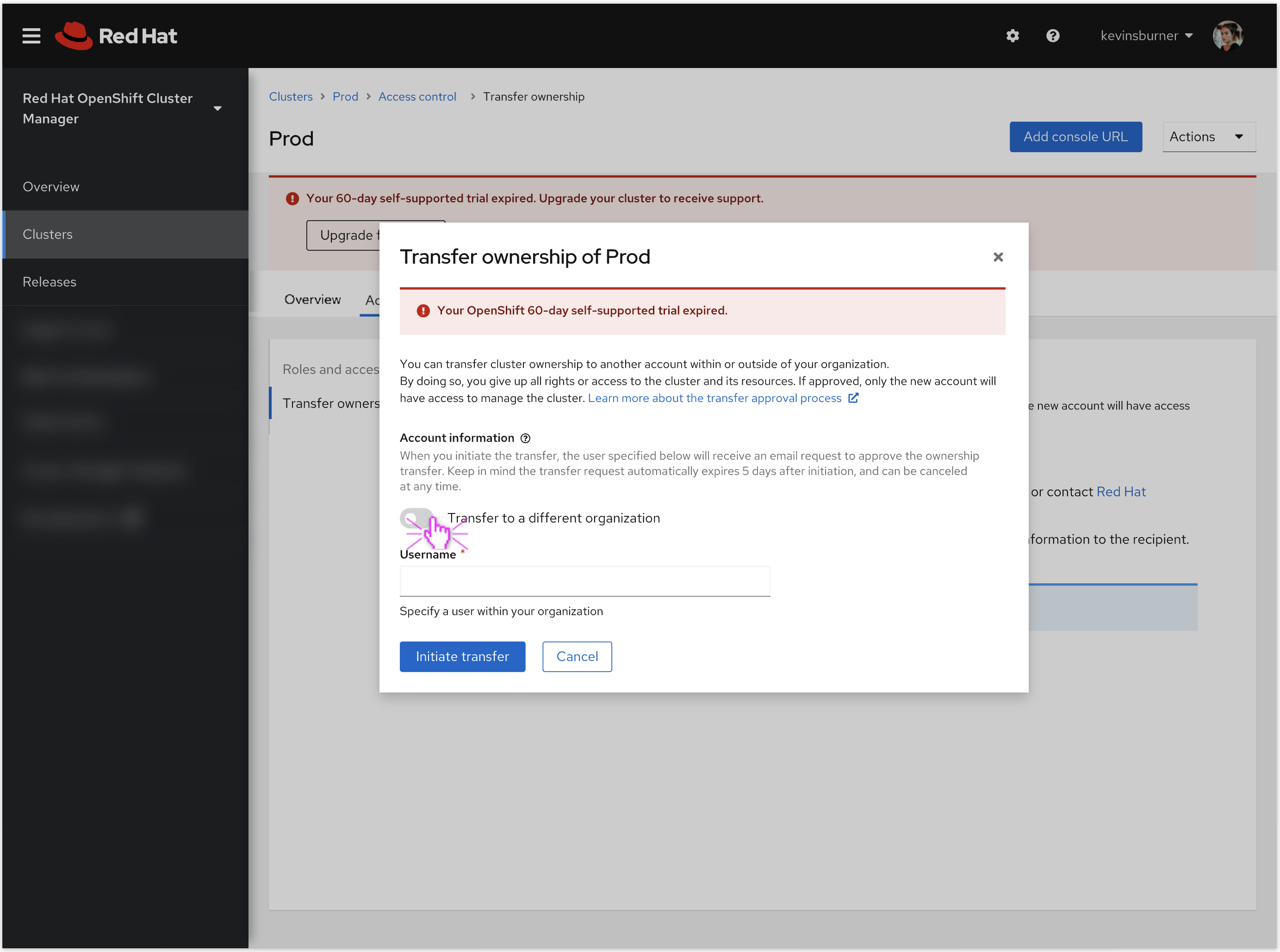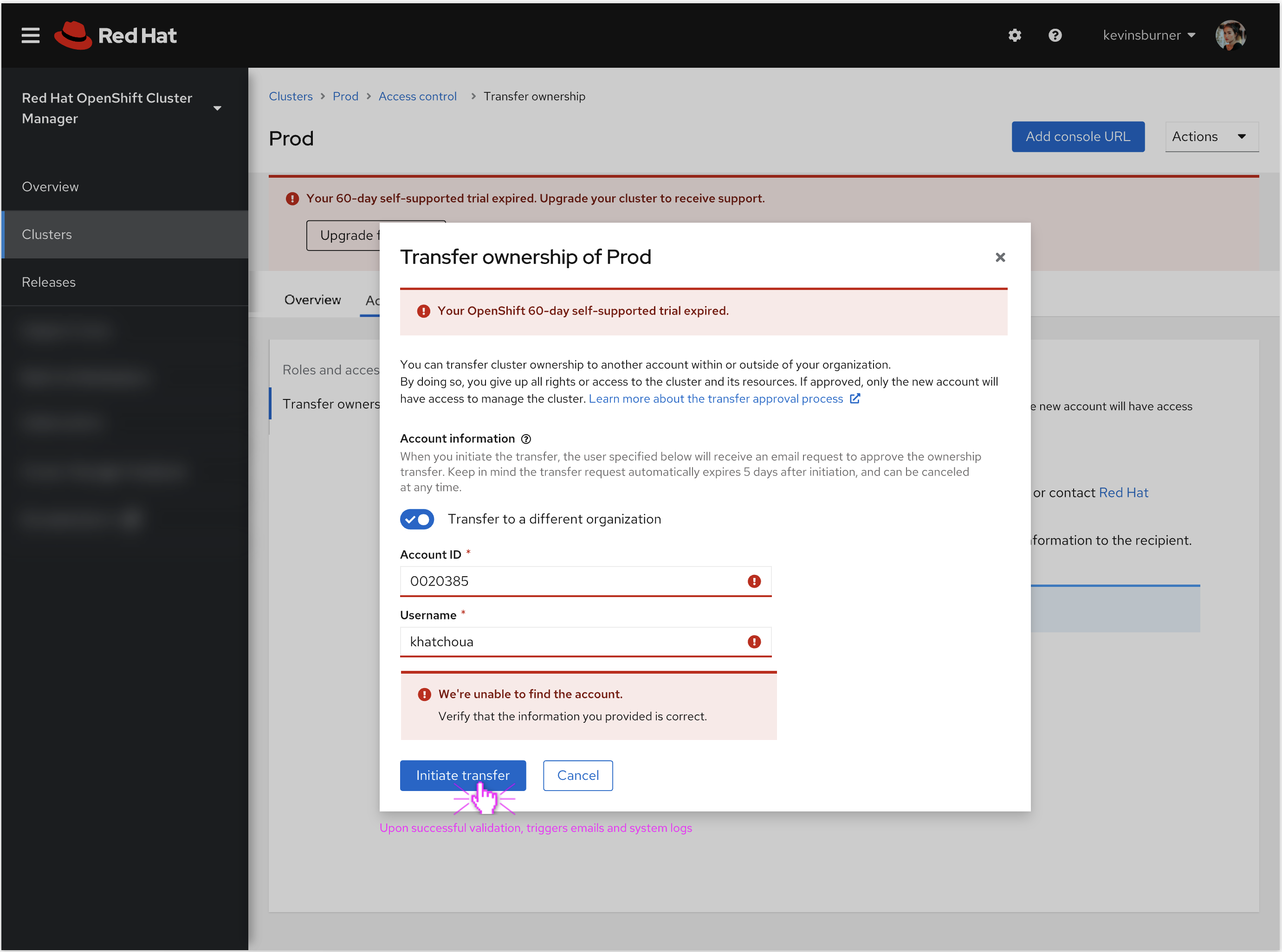 Cluster ownership transfer modal to include 3 fields in the UI: Username, Org ID and Account number (EBS account ID).