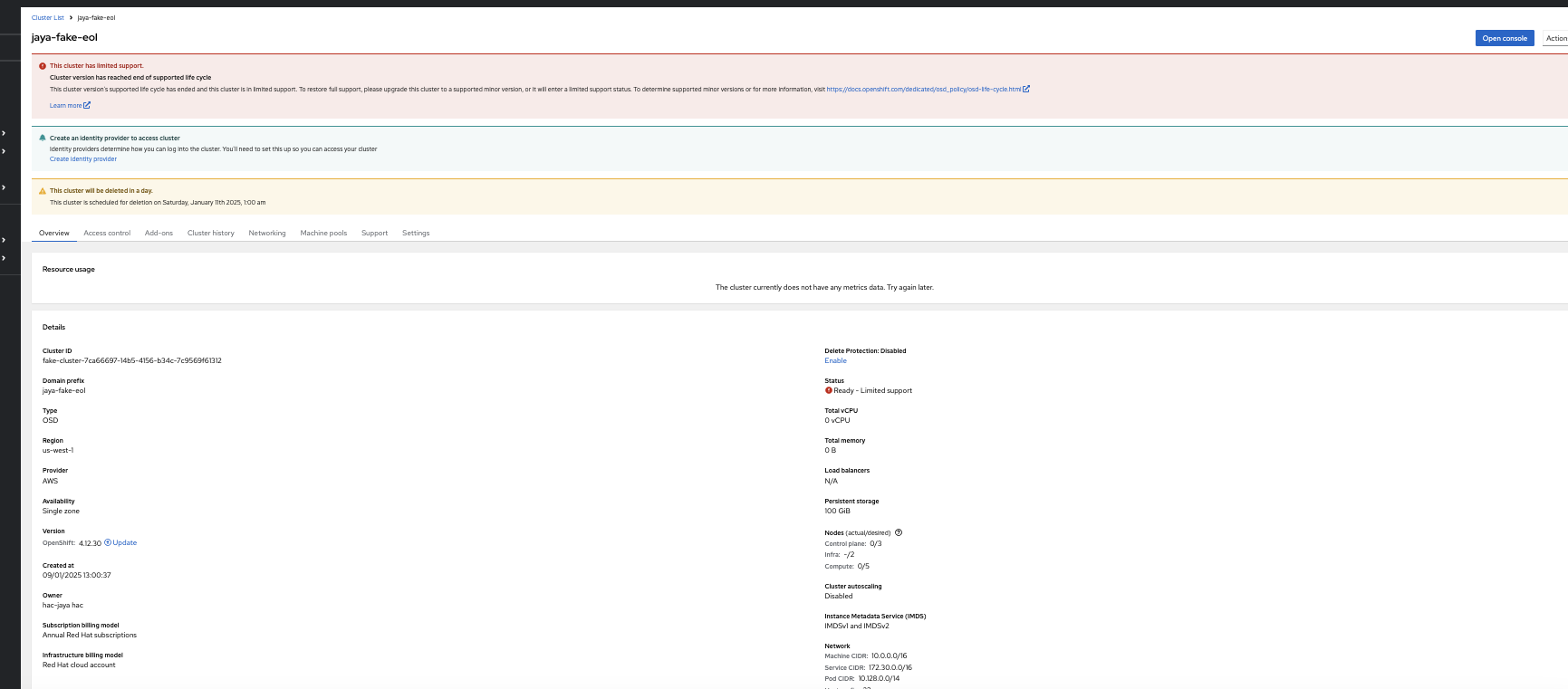 - Wait for a while and check that cluster should be limited support status and you will get an email about the limited support status due to version reached EOL