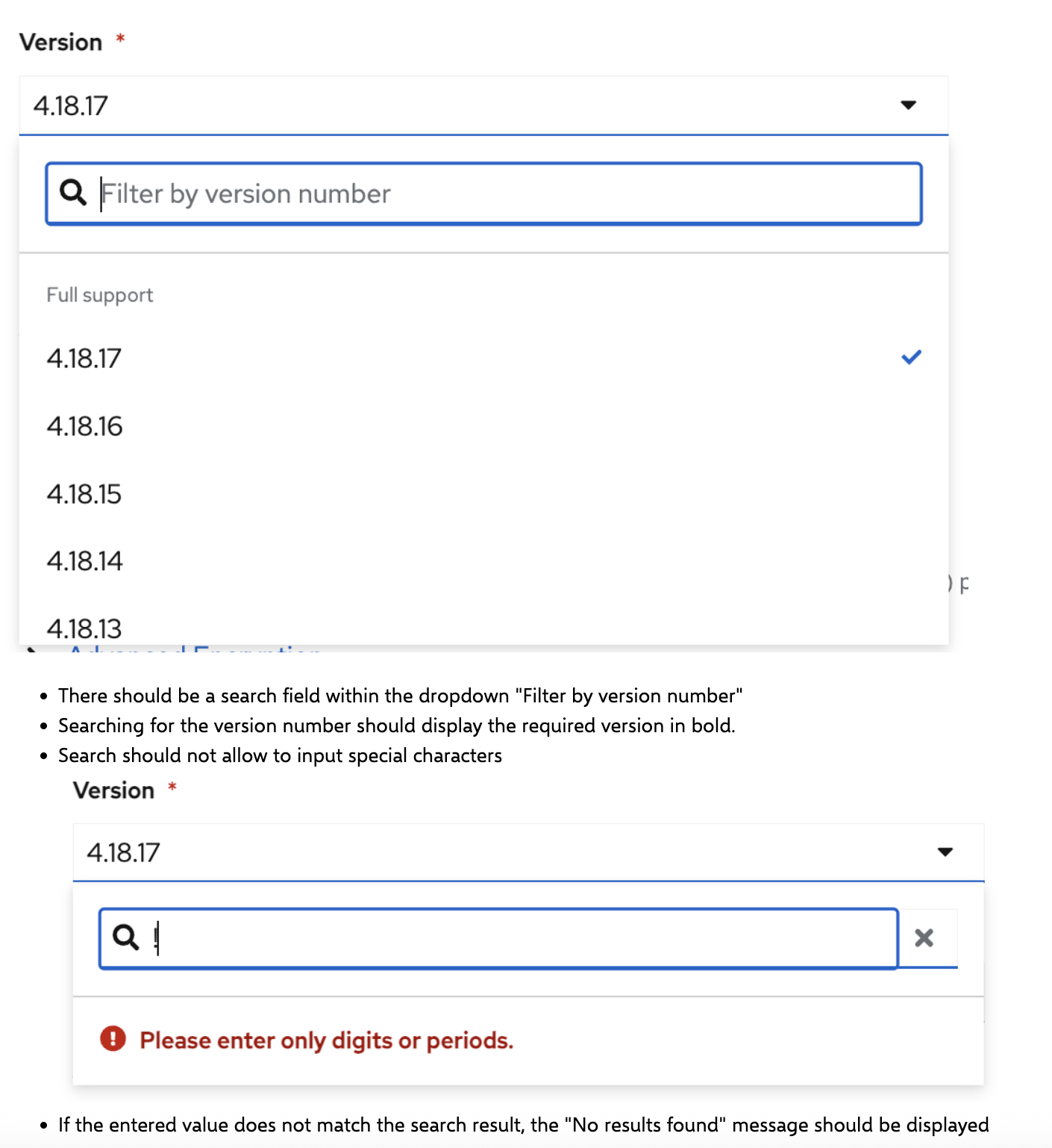 The "Filter by version" field in version drop-down widget us missing from ROSA wizard. The same has been seen with OSD wizard.