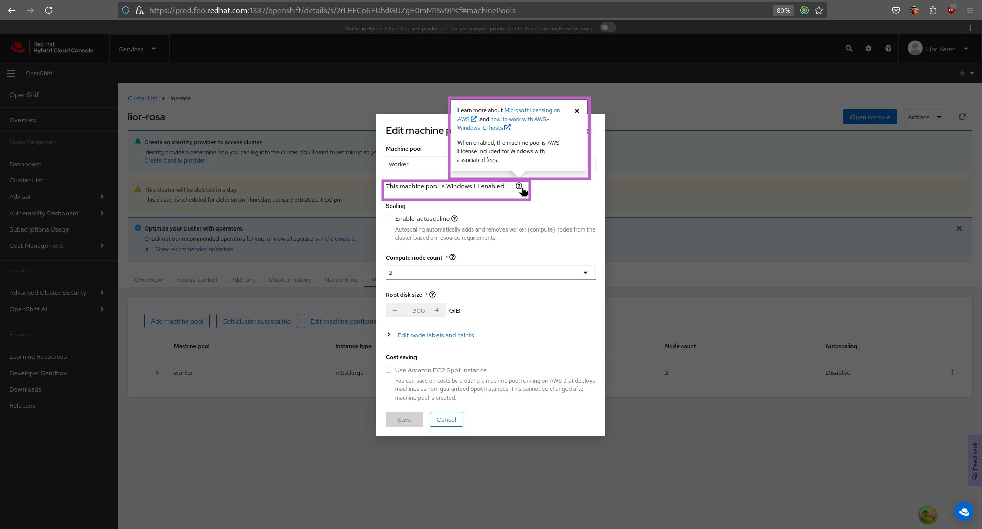 • On the "Edit machine pool" modal, add text specifying if the currently edited machine pool has Windows LI enabled.