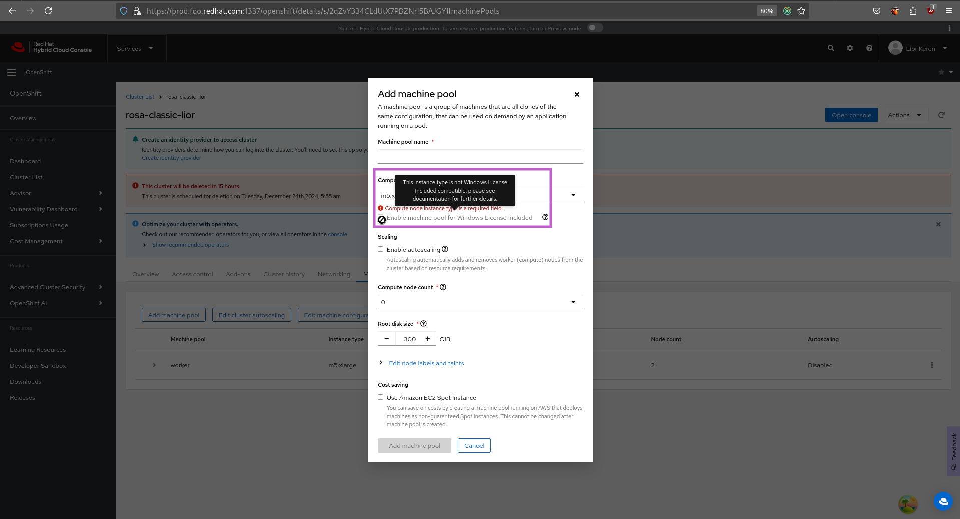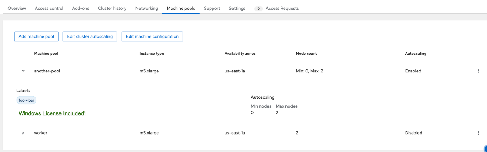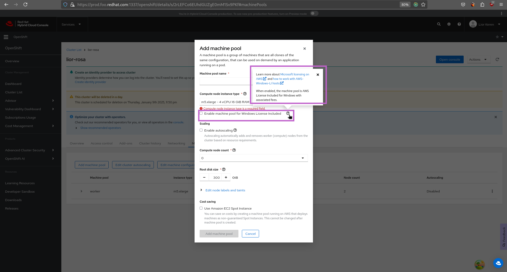 When enabled, the machine pool is AWS License Included for Windows with associated fees.