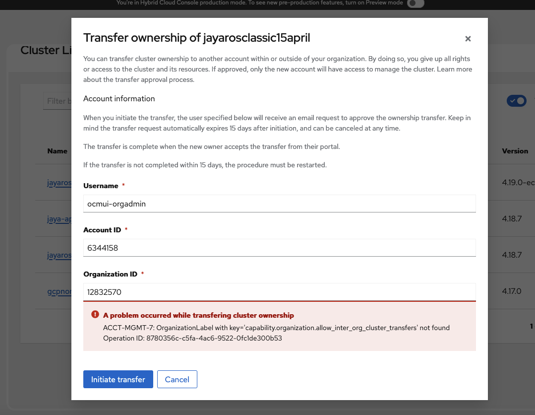 The "Transfer cluster ownership" action was blocked with inline error that talks about missing capability i.e. "capability.organization.allow_inter_org_cluster_transfers"