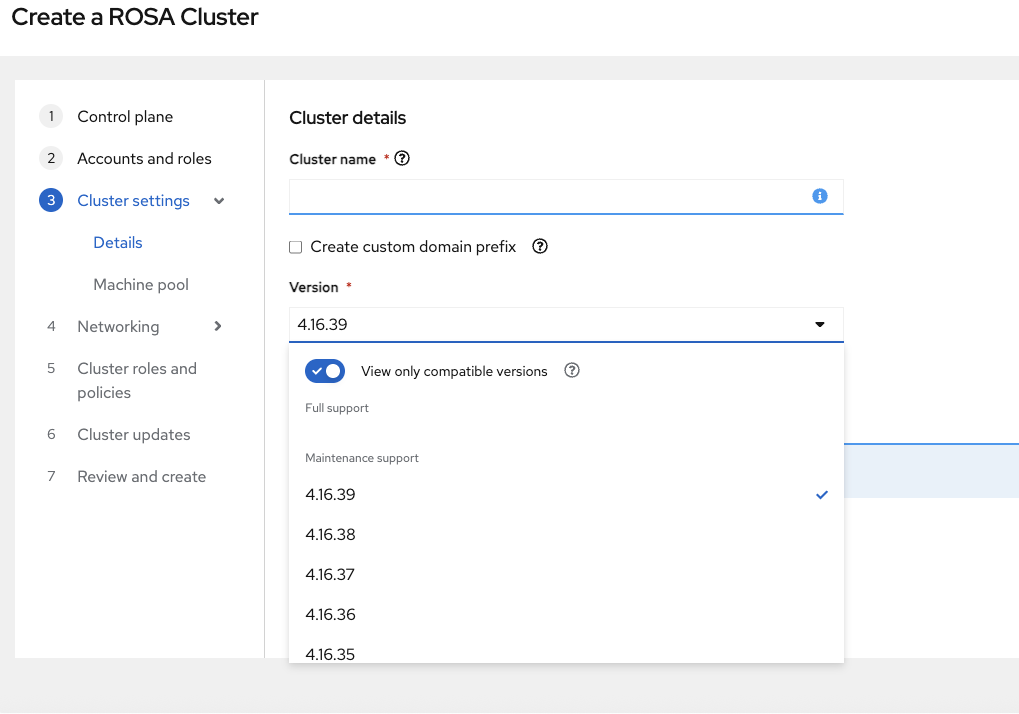 The list of versions shown in the ROSA hosted wizard doesn't match those in the CLI workflow. Some versions available in the ROSA CLI workflow are not displayed in the hosted wizard. For example, OCP versions 4.17 and 4.18 do not appear in the ROSA hosted wizard when a user selects an installer role that only supports versions up to 4.16. However, the ROSA CLI cluster installation workflow still displays all versions, including 4.17 and 4.18, in this scenario