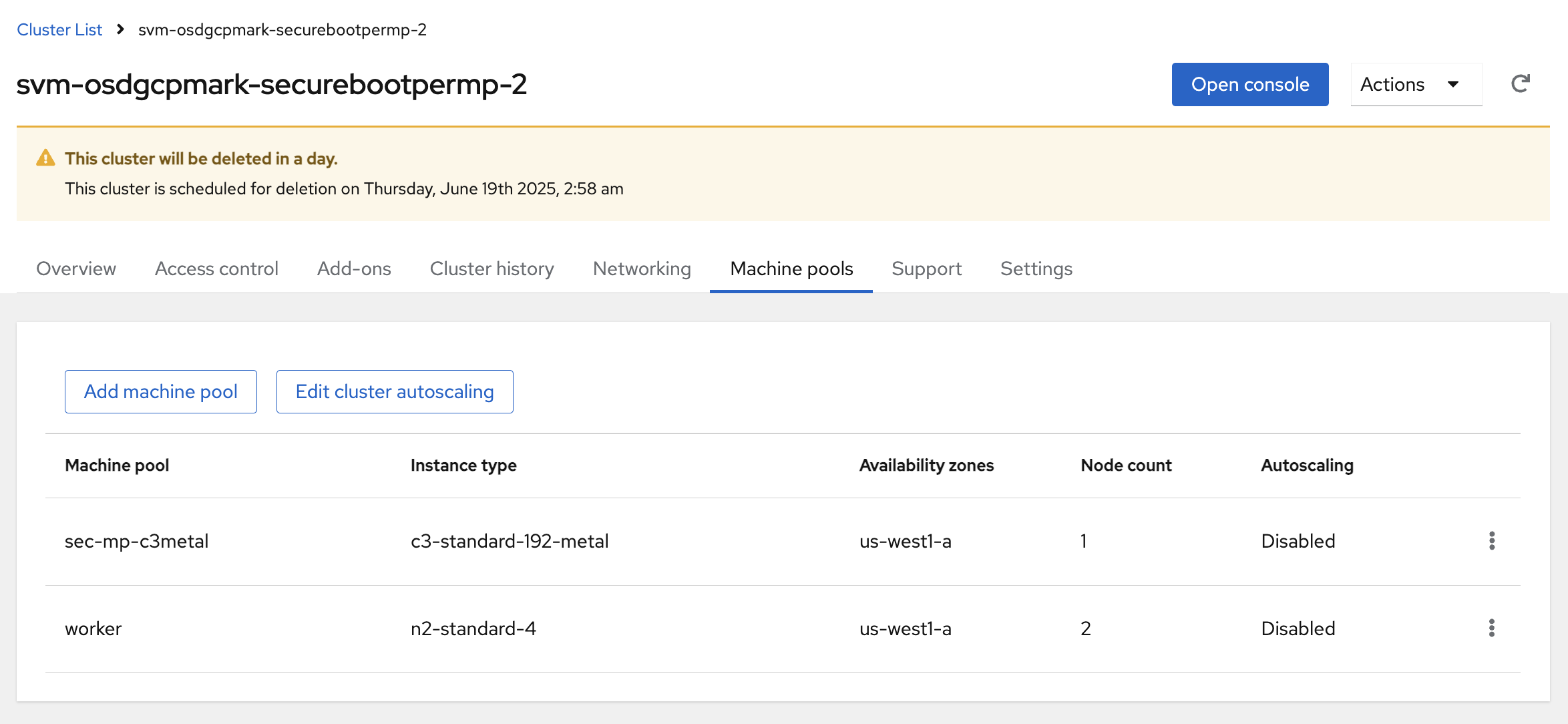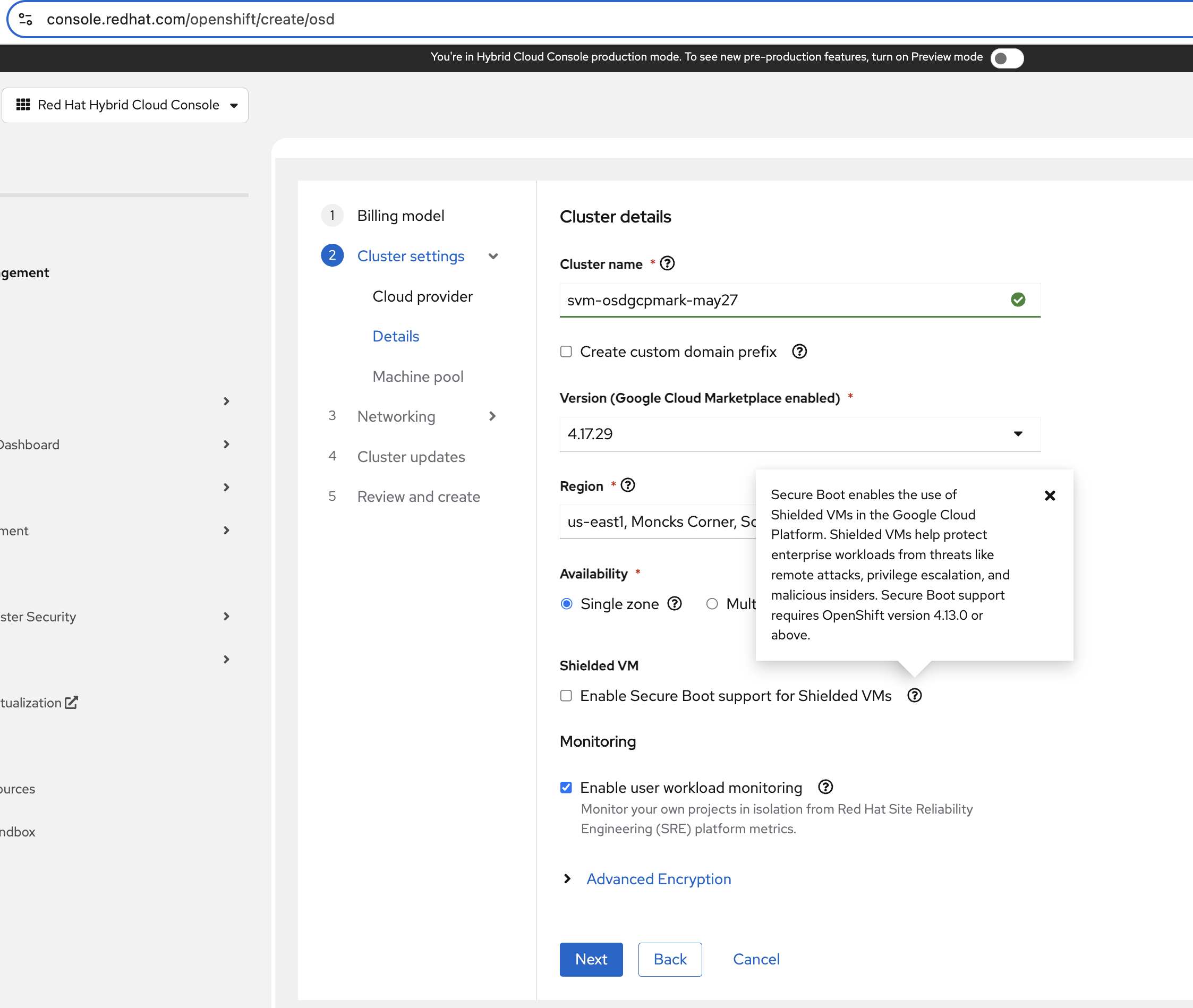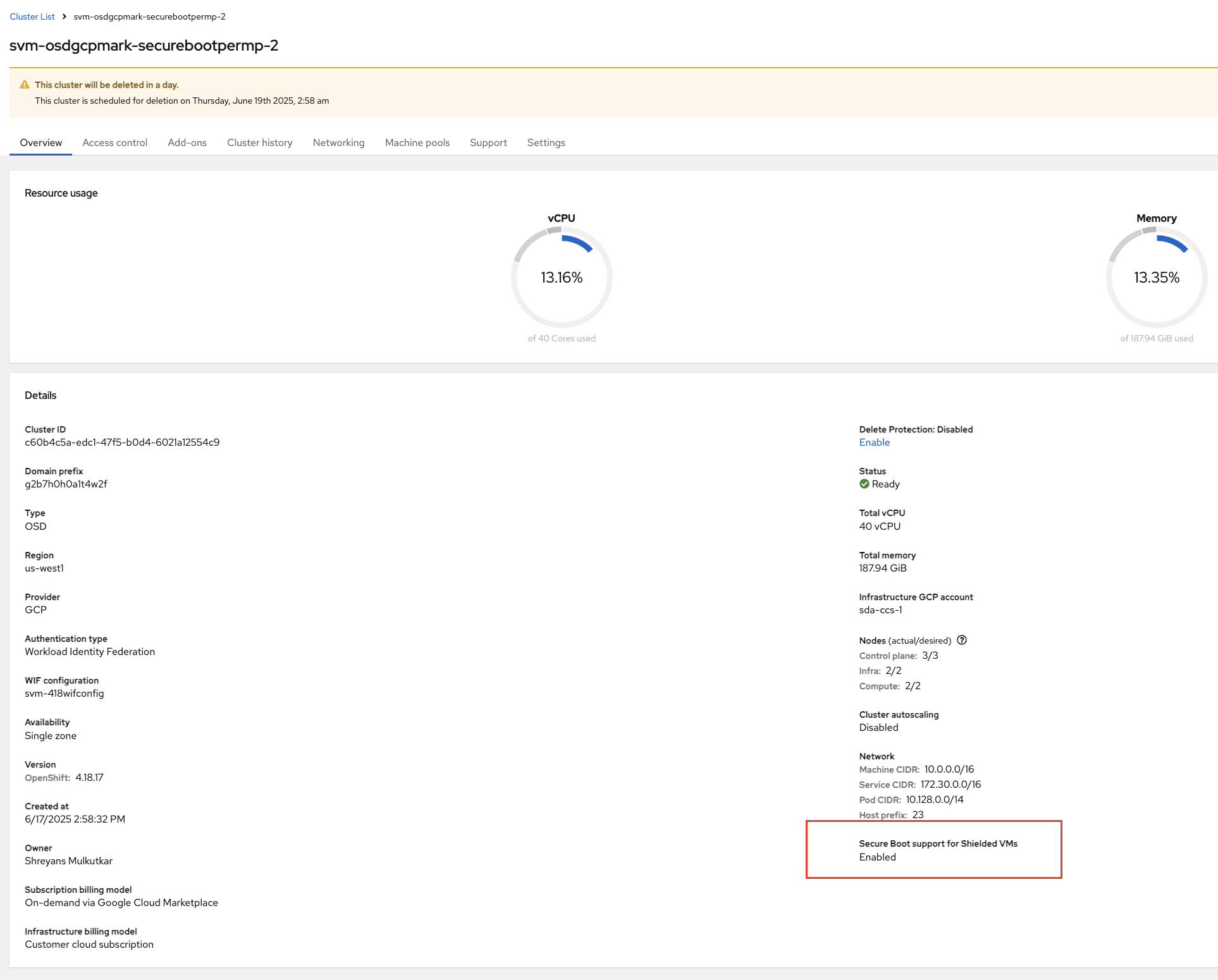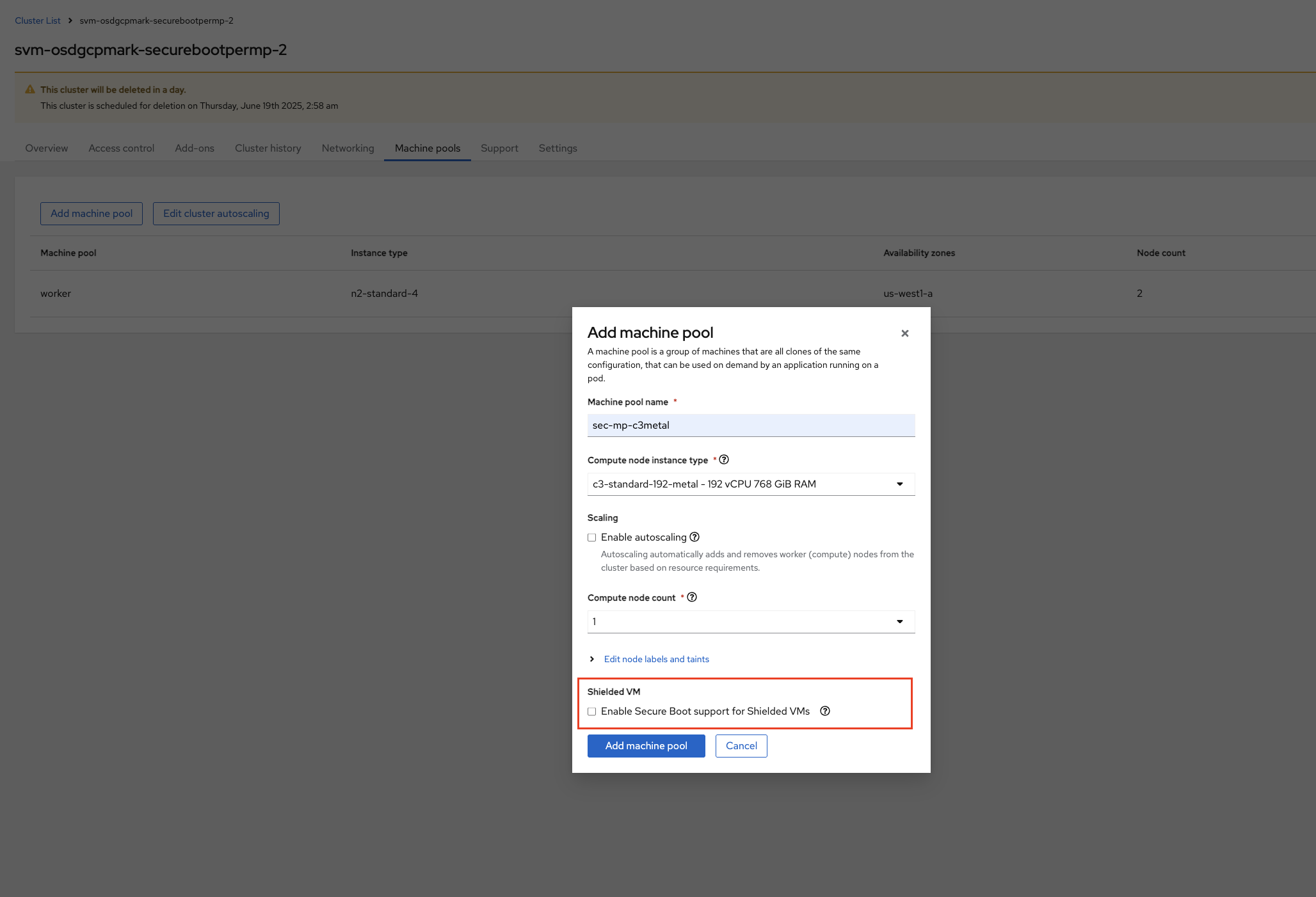 - When creating a new machine pool for OSD GCP clusters, a new secure boot field will be shown in the machine pool form.