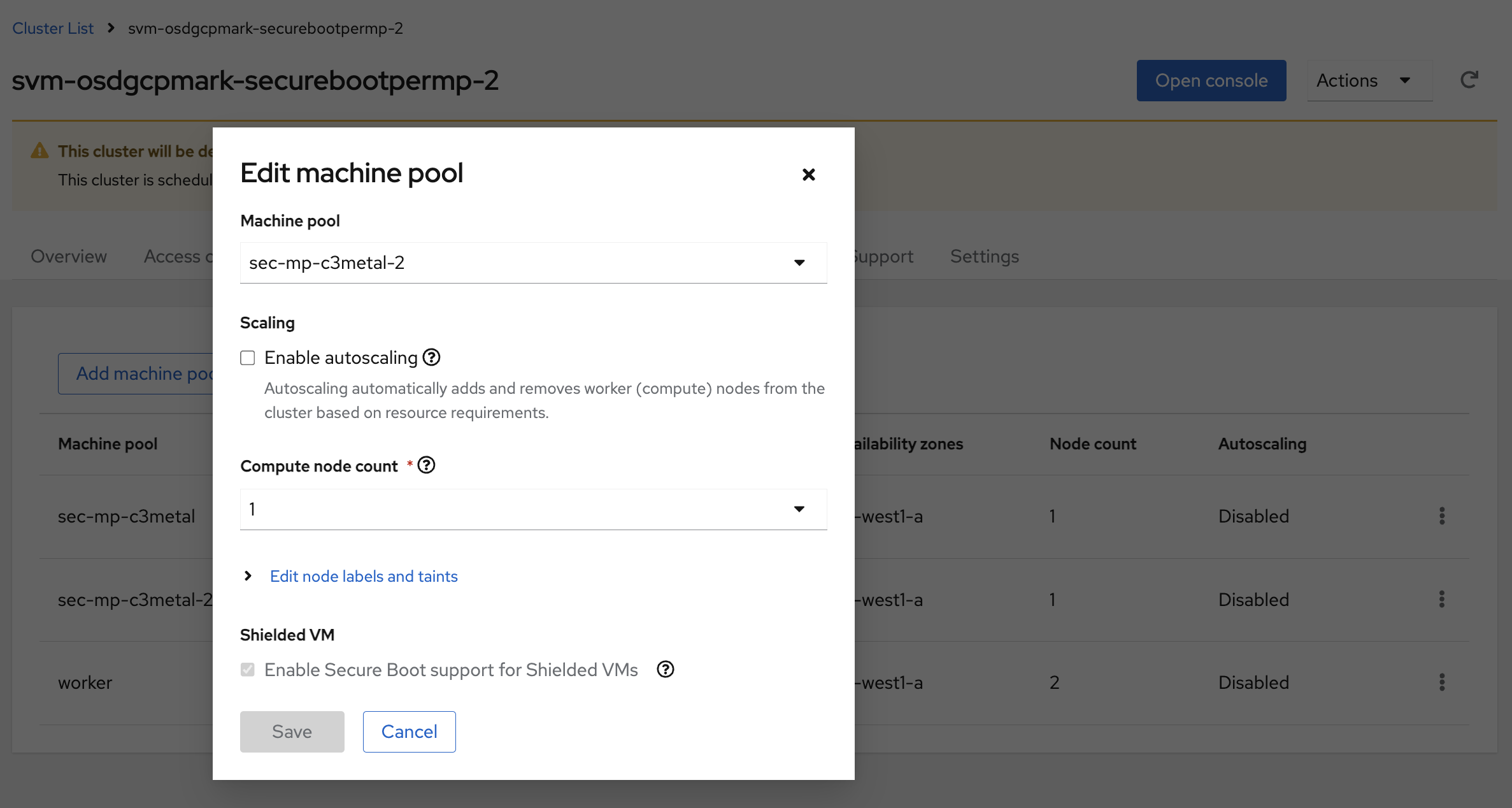 - The secure boot setting of a machine pool cannot be changed after its creation. The field must be disabled when editing a machine pool. The secure boot value of an existing machine pool will be retrieved from the machine pool if present, otherwise it will be the one inherited from the cluster.
