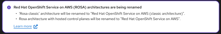 • The banners will be displayed for a month. Shown/hidden via a feature flag which will initially be enabled -> FF is named "ocmui-rosa-architecture-renaming-alert" and has been enabled on stage.