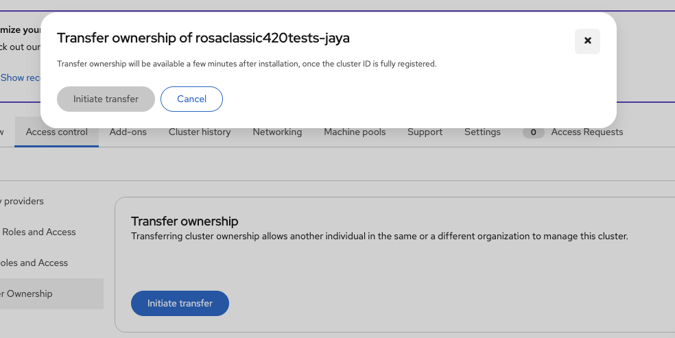 After a few minutes of the cluster becoming Ready, the ownership transfer action should become available.
