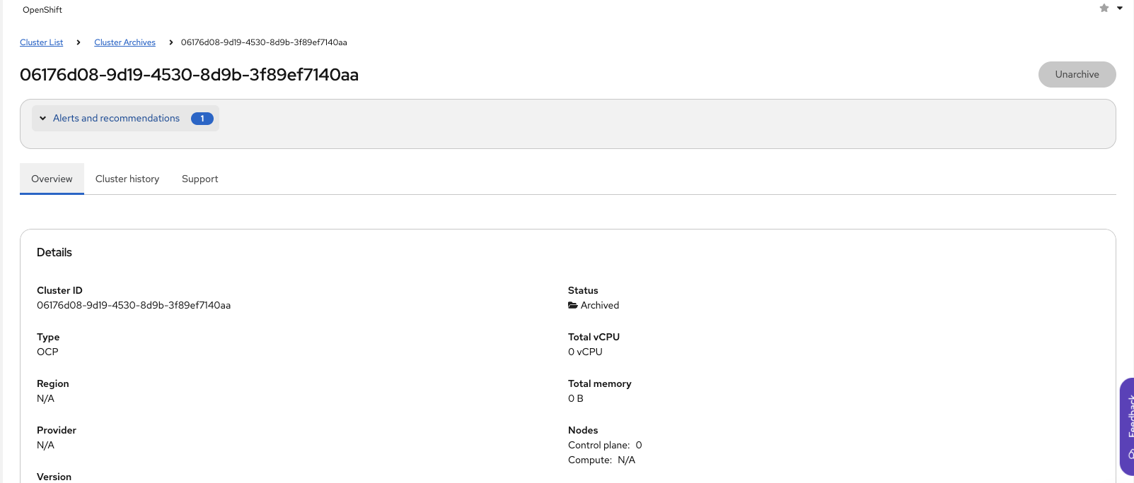 For an archived OCP cluster, an "Alert and Recommendations" option is displayed with a count value of 1. However, when the section/banner is expanded, no content is shown to the user.