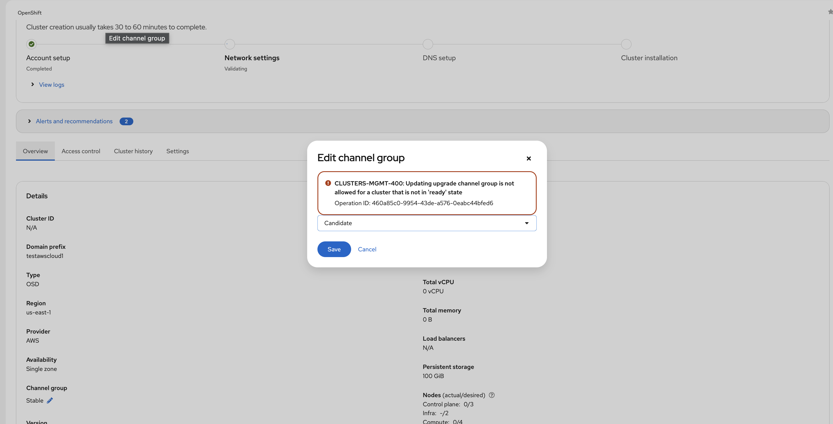 The current design allows the channel group option to be changed(as shown in the below screenshot) even when the cluster is not ready. This is not a great UX and we shouldn't allow user to do any action if cluster is in bad shape/ installing/ or not ready.