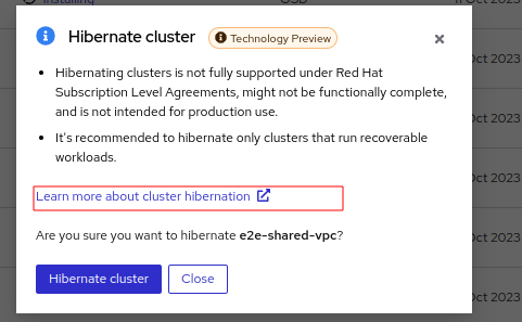 - Click and see the "Learn more about cluster hibernation" link from the hibernate cluster dialog.
