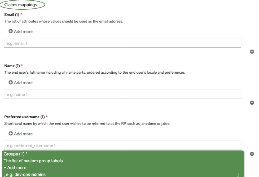 • At least one 'group' is required. (I think, pls double-check.  All other 'Claims' fields seem to be required, but not sure about 'groups'.)  At least one claim must be entered based on the code (so either email, username, name, group). Groups are not required for the API nor should they be required for an open ID solution.
