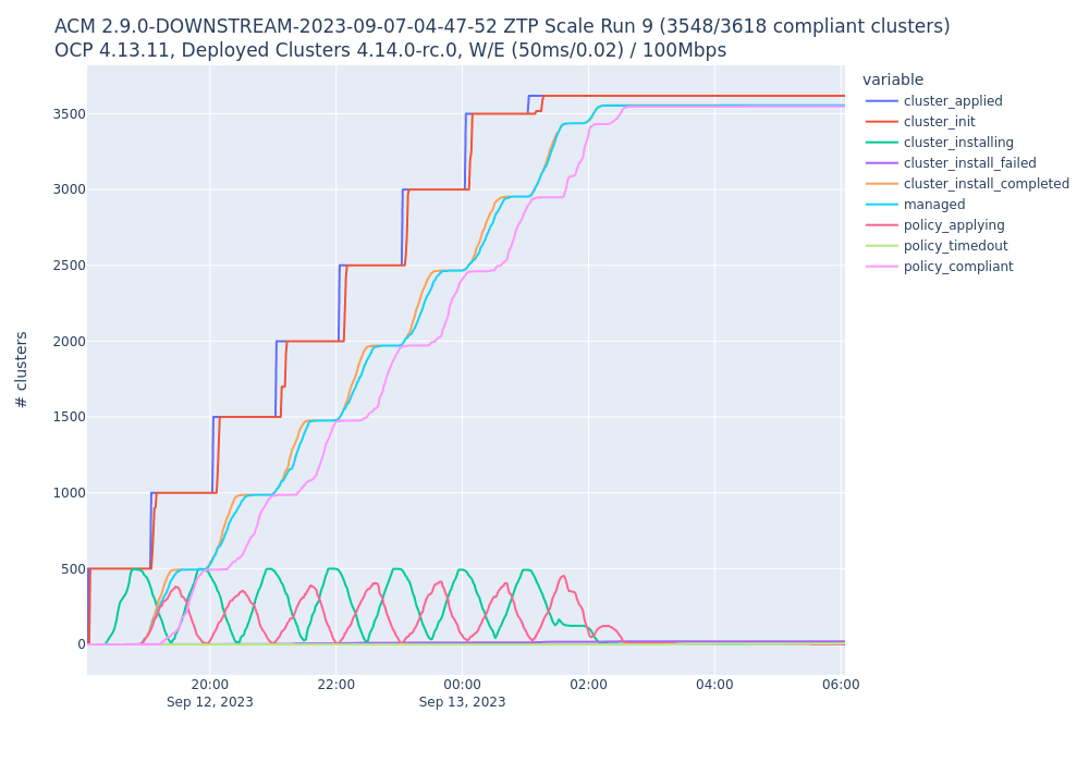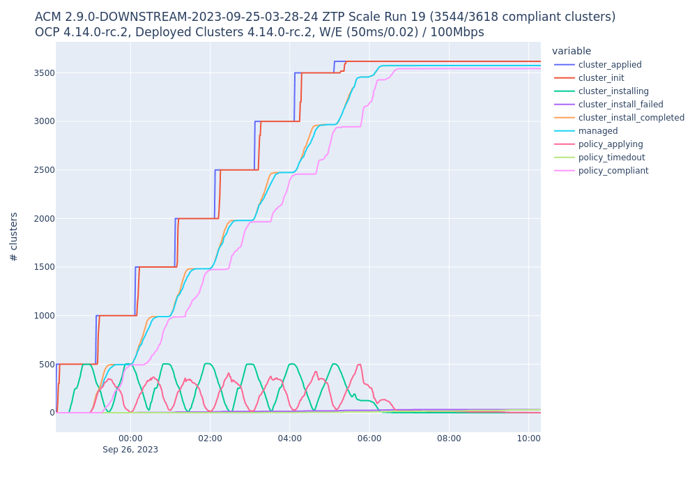 While provisioning 3618 SNOs using ZTP with ACM 2.9, it was observed a large slow down in the completion times for SNOs to successfully complete installs. This seems to start around 1800 managed clusters and continue on for the remainder of the test. Using the same deployed OCP and ACM version but with a 4.13 hub, this issue is not observed. Approximate difference in timing for clusters to install between two hub ocp versions. 4.14 Hub Count: 3571 Min: 2915.0 Average: 9191.5 50 percentile: 6537.0 95 percentile: 16942.5 99 percentile: 17948.5 Max: 21003.0 4.13 Hub Count: 3555 Min: 2579.0 Average: 4036.5 50 percentile: 4046.0 95 percentile: 4868.3 99 percentile: 5174.8 Max: 5741.0
