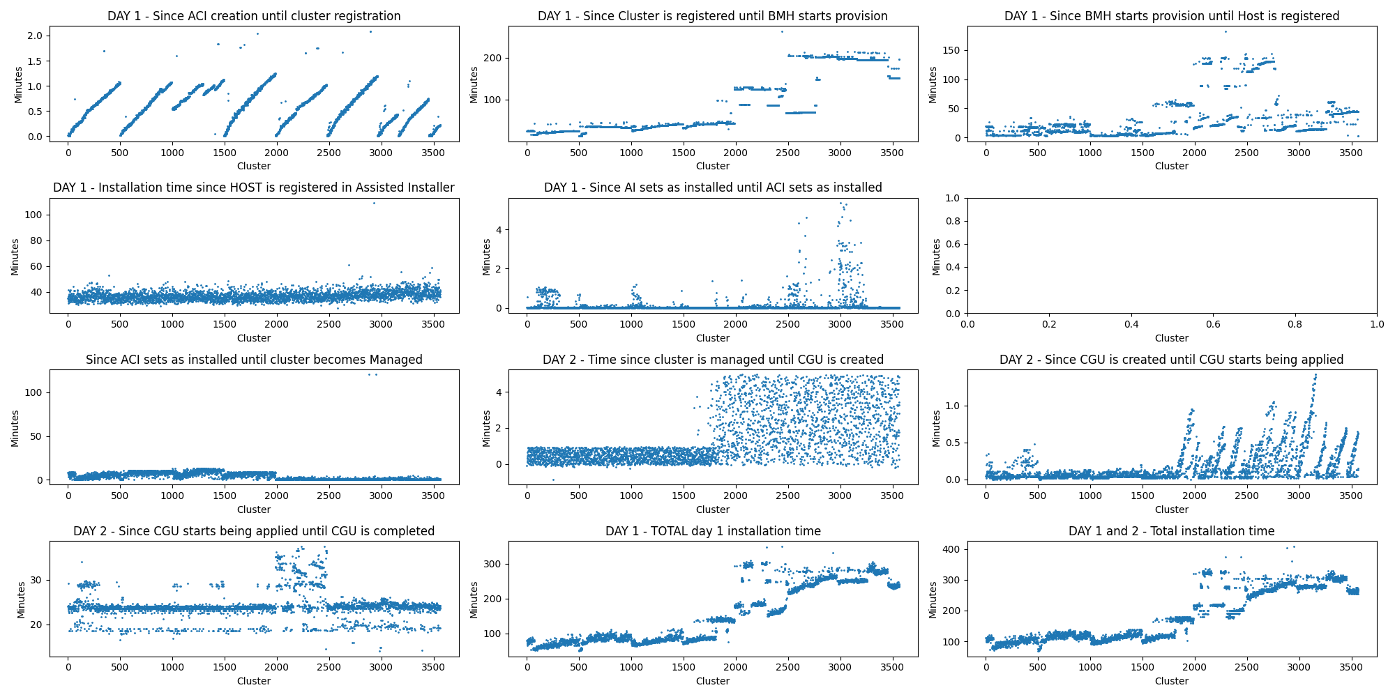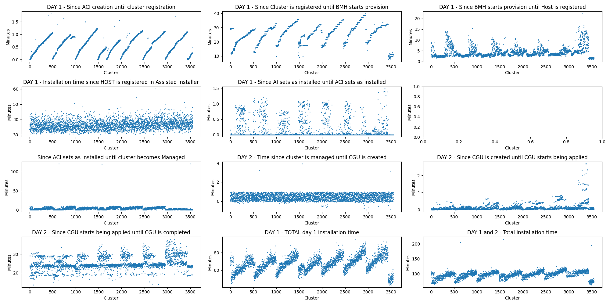 Attached are graphs from both a 4.14 and 4.13 run for comparison. It isn't clear what is causing the slow down, however some analysis performed by scripts show a large growth in timing for the time required between when a cluster is register and when the bmh starts provisioning. Since the only difference is the hub ocp version, it must be a included component in OCP which is driving this slow down.