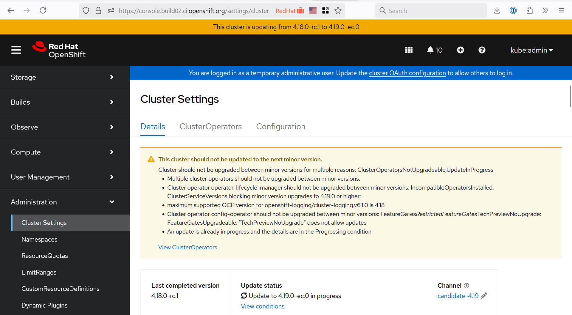 The cluster start to upgrade. Some component will upgrade to 4.19, while the overall upgrade is blocked due to the maxVersion set for OpenShift Logging Operator