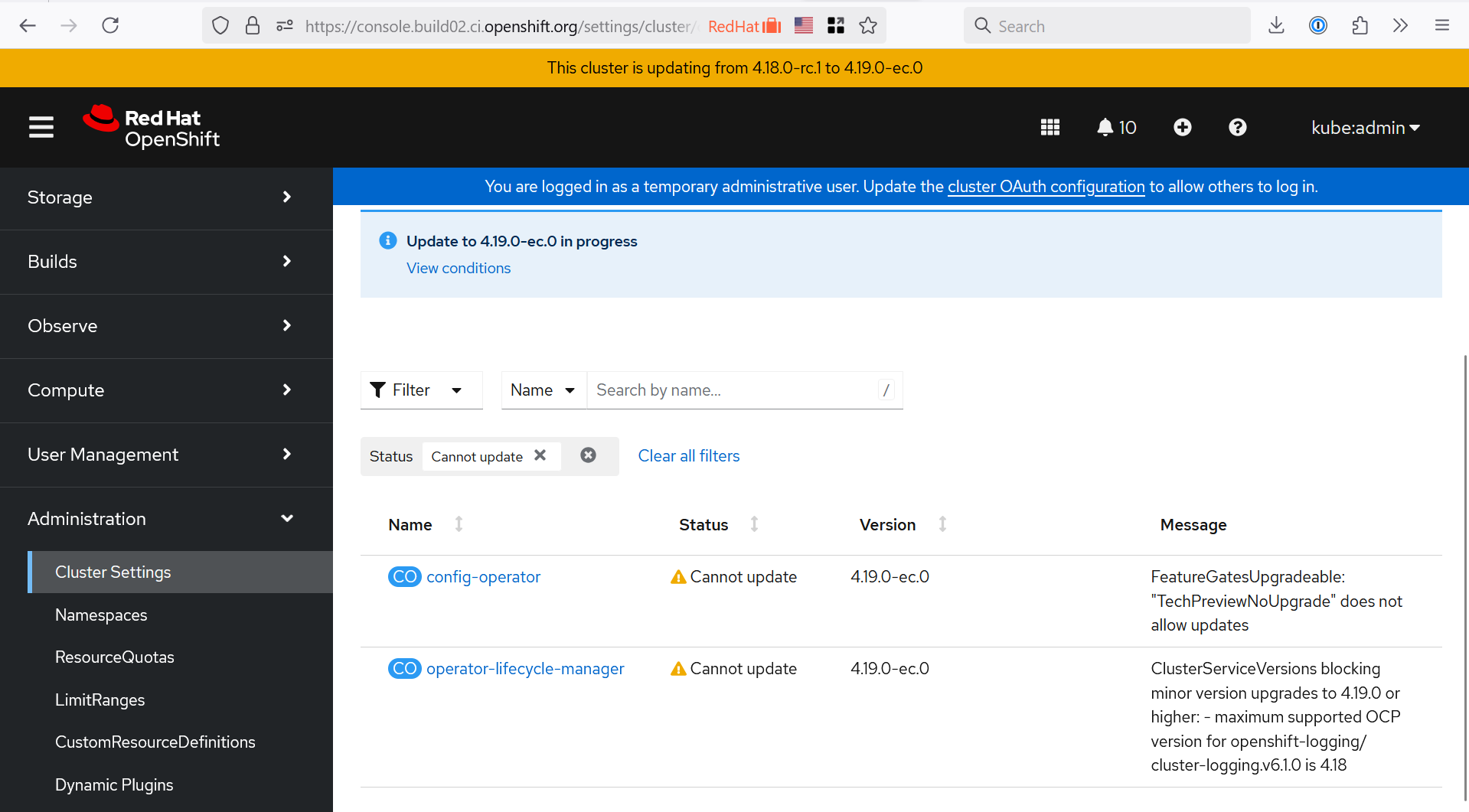 Some operator has maxVersion set. For example, OpenShift Logging Operator v6.1 only support maximum OCP 4.18. This operator will block the upgrade to 4.19 (as in screenshot).