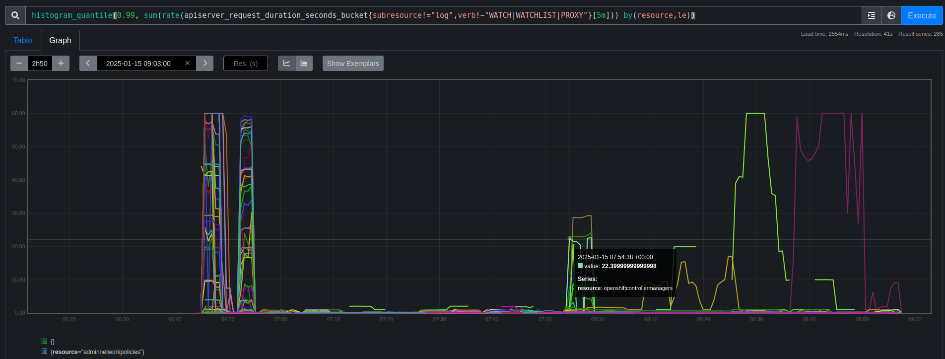 histogram_quantile(0.99, sum(rate(apiserver_request_duration_seconds_bucket{subresource!="log",verb!~"WATCH|WATCHLIST|PROXY"}[5m])) by(resource,le))