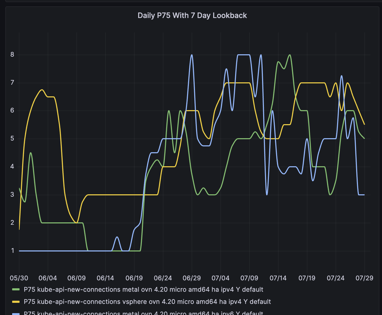 Beginning around June 18th, we can see an increase in disruption metrics for 'kube-api-new-connections' in Metal and vSphere in '4.20' duing 'micro' upgrades. Changing the 'lookback days' to '1' allows us to see the pattern in the graph that leads to the 06/18/25 date. In '4.19' the pattern is less clear in Metal, but does appear present in VSphere. There are many occurrences of disruption within the job runs in the window of 4s and above. The percentage of non-zero disruption seems to be around 85-90% throughout the window.