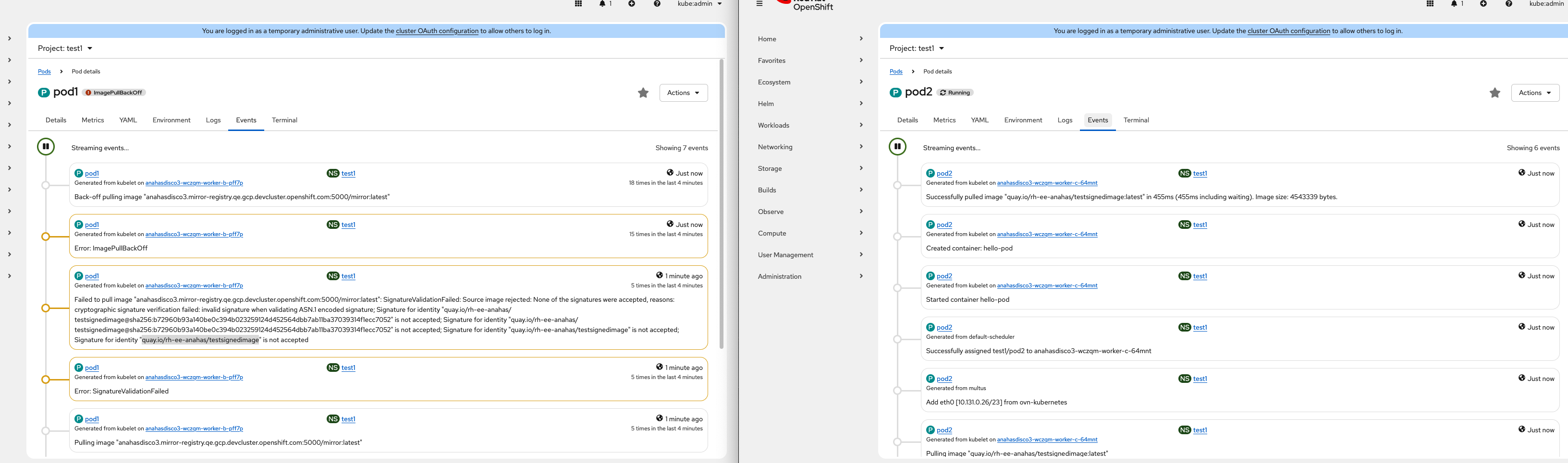 4. Create a pod pulling the image from mirror repo, an SignatureValidationError will happen "d_log1.txt", "success_fail.png" (mirror repo pod is on the left side)