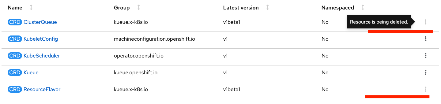 Custom resources are not deleted properly when you uninstall {kueue-name}:: After you uninstall the {kueue-op} using the *Delete all operand instances for this operator* option in the {product-title} web console, some {kueue-name} custom resources are not fully deleted. These resources can be viewed in the *Installed Operators* view with the status *Resource is being deleted*. As a workaround, you can manually delete the resource finalizers to remove them fully.