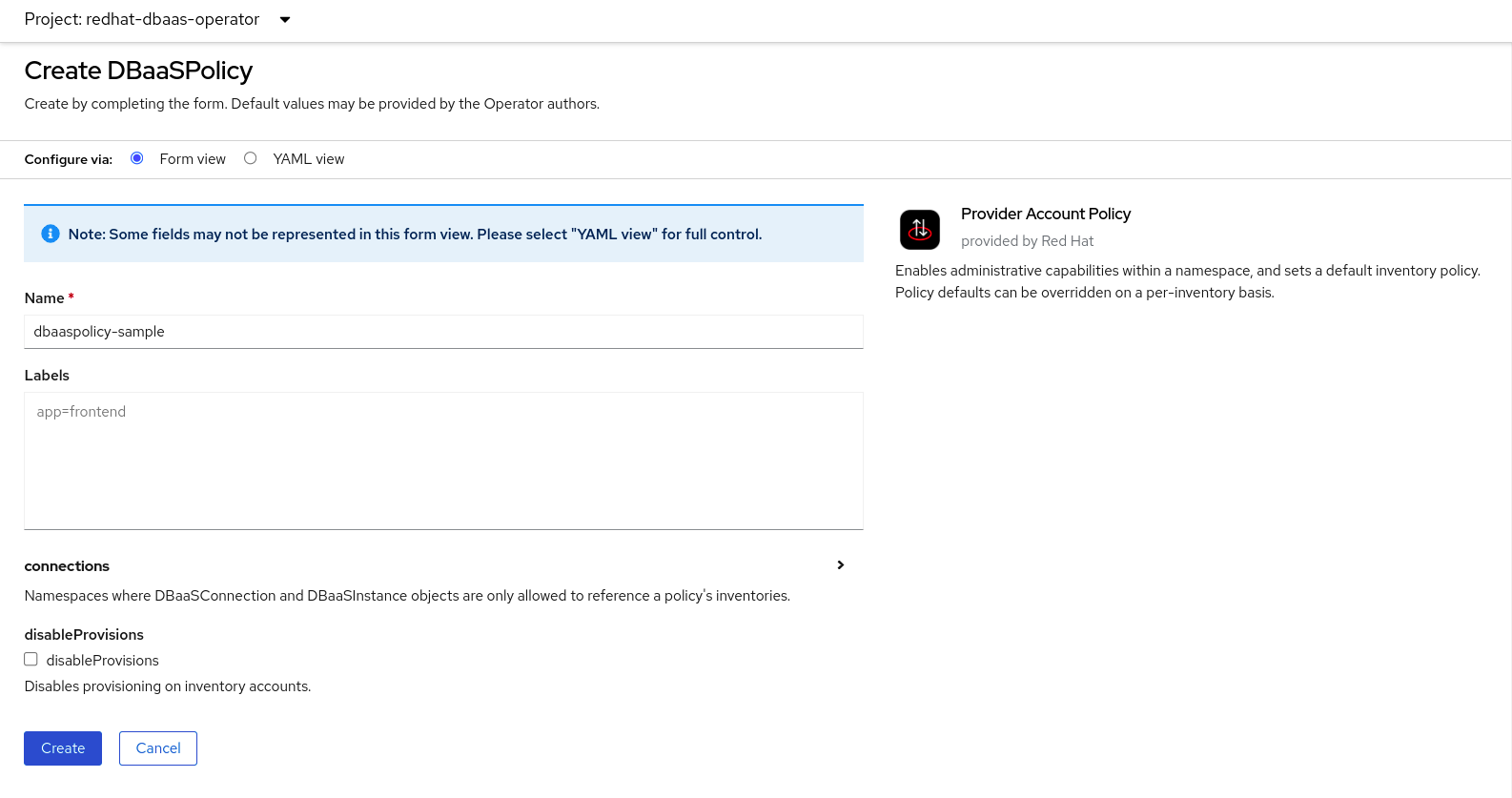 1. Make sure RHODA Operator is installed on the Openshift cluster 2. Login to Openshift cluster and navigate to Operators --> Installed Operators on the left vertical nav menu 3. Select "redhat-dbaas-operator" from the project drop down and Select "Openshift Database Access Operator" 4. Click on "Provider Account Policy" tab and Click on "Create DBaaSPolicy" button 5. On the "Create DBaaSPolicy" screen, the width of Labels text box is not consistent and larger than other textboxs