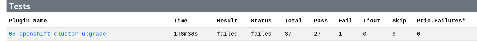 | 05-openshift-cluster-upgrade | 1h8m38s | failed | failed | 36 | 26 | 0 | 0 | 9 | 0 |