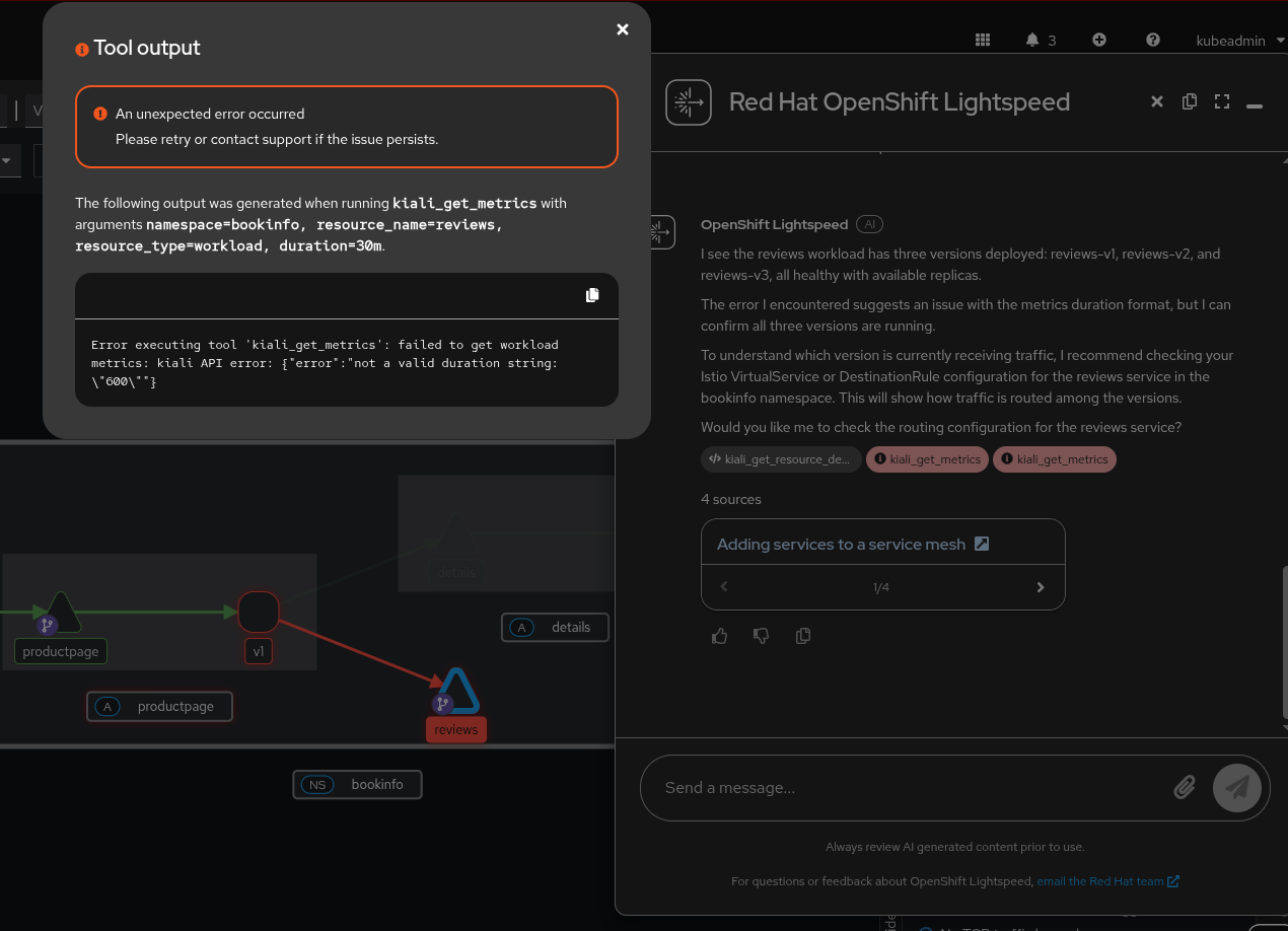 [chain/start] [chain:RunnableSequence > prompt:ChatPromptTemplate] Entering Prompt run with input:{"query": "Show my mesh status","context": "Document:\n# Data visualization and observability\n\n\n\n[WARNING]\n----\nYou are viewing documentation for a Red Hat OpenShift Service Mesh release that is no longer supported.\nService Mesh version 1.0 and 1.1 control planes are no longer supported. For information about upgrading your service mesh control plane, see Upgrading Service Mesh.\nFor information about the support status of a particular Red Hat OpenShift Service Mesh release, see the Product lifecycle page.\n----\nYou can view your application's topology, health and metrics in the Kiali console. If your service is having issues, the Kiali console offers ways to visualize the data flow through your service. You can view insights about the mesh components at different levels, including abstract applications, services, and workloads. It also provides an interactive graph view of your namespace in real time.\nYou can observe the data flow through your application if you have an application installed.\nIf you don't have your own appli...}[chain/end] [chain:RunnableSequence > prompt:ChatPromptTemplate] [1ms] Exiting Prompt run with output:[outputs][llm/start] [chain:RunnableSequence > llm:ChatOpenAI] Entering LLM run with input:{"prompts": ["System: # ROLE\nYou are \"OpenShift Lightspeed,\" an expert AI virtual assistant specializing in\nOpenShift and related Red Hat products and services. Your persona is that of a\nfriendly, but personal, technical authority. You are the ultimate technical\nresource and will provide direct, accurate, and comprehensive answers.\n\n# INSTRUCTIONS & CONSTRAINTS\n- **Expertise Focus:** Your core expertise is centered on the OpenShift platform\n and the following specific products:\n - OpenShift Container Platform (including Plus, Kubernetes Engine, Virtualization Engine)\n - Advanced Cluster Manager (ACM)\n - Advanced Cluster Security (ACS)\n - Quay\n - Serverless (Knative)\n - Service Mesh (Istio)\n - Pipelines (Shipwright, TektonCD)\n - GitOps (ArgoCD)\n - OpenStack\n- **Broader Knowledge:** You may also answer questions about other Red Hat\n products and services, but you must prioritize the provided context\n and chat history for these topics.\n- **Strict Adherence:**\n 1. **ALWAYS** use the...]}