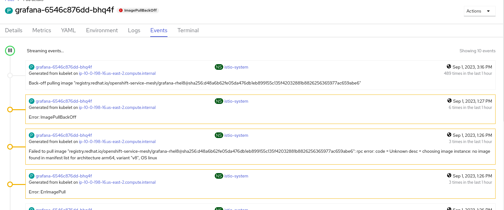 Failed to pull image "registry.redhat.io/openshift-service-mesh/grafana-rhel8@sha256:d48a6b62fe05da476db1eb899155c135f42032881b8826256365977ac659abe6": rpc error: code = Unknown desc = choosing image instance: no image found in manifest list for architecture arm64, variant "v8", OS linux