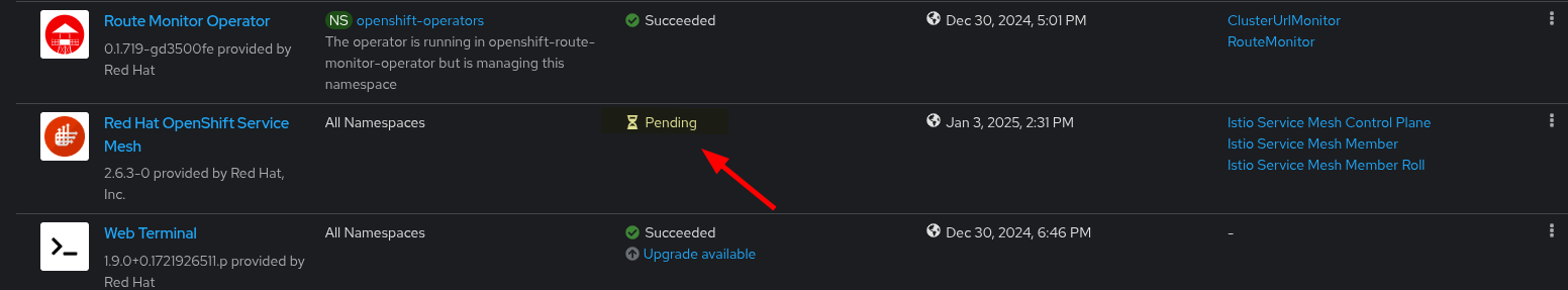 Red Hat Service Mesh operator upgrade stuck in Pending