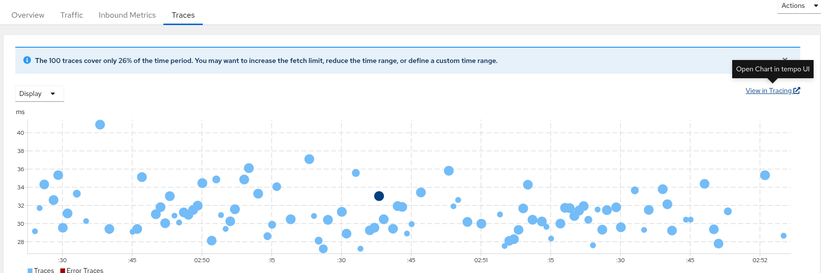 The traces should be visible in Kiali Traces functionality and "View In Tracing" should redirect to correct URL.