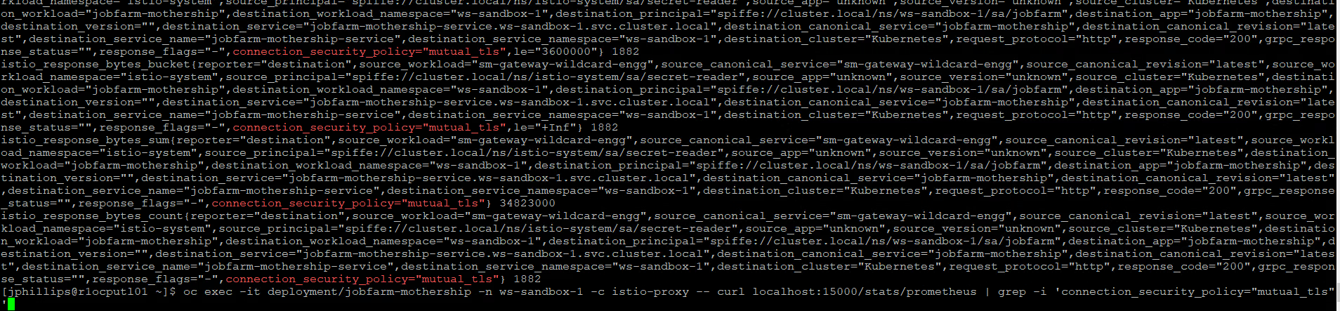 • Curl from inside a container to another internal endpoint as part of the same MTLS chain --> observe that traffic is NOT visualized at all. (Confirm that traffic does progress through the gateway and is showing up at the endpoint, and MTLS is enabled)