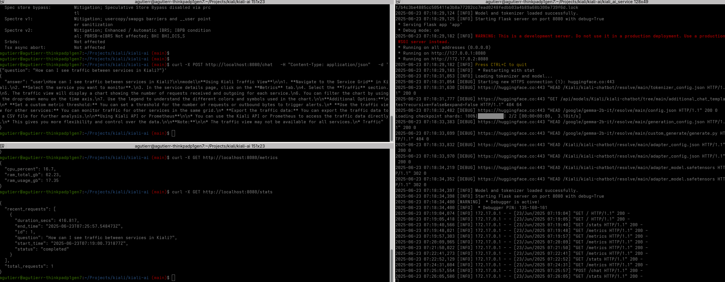 Create a standalone Python-based service (e.g., Flask or FastAPI) that exposes endpoints to serve responses from different LLMs, starting with the fine-tuned Kiali model. The service must support: