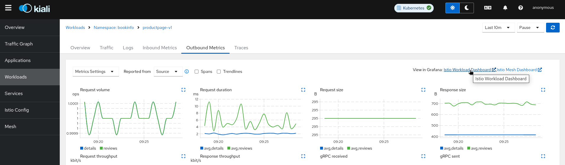 The Kiali integration with Grafana consist on URLs to the different dashboards, depending on the view: Control plane, workload, service, ... This URL will redirect to the corresponding dashboard using different variables predefined in the configuration.