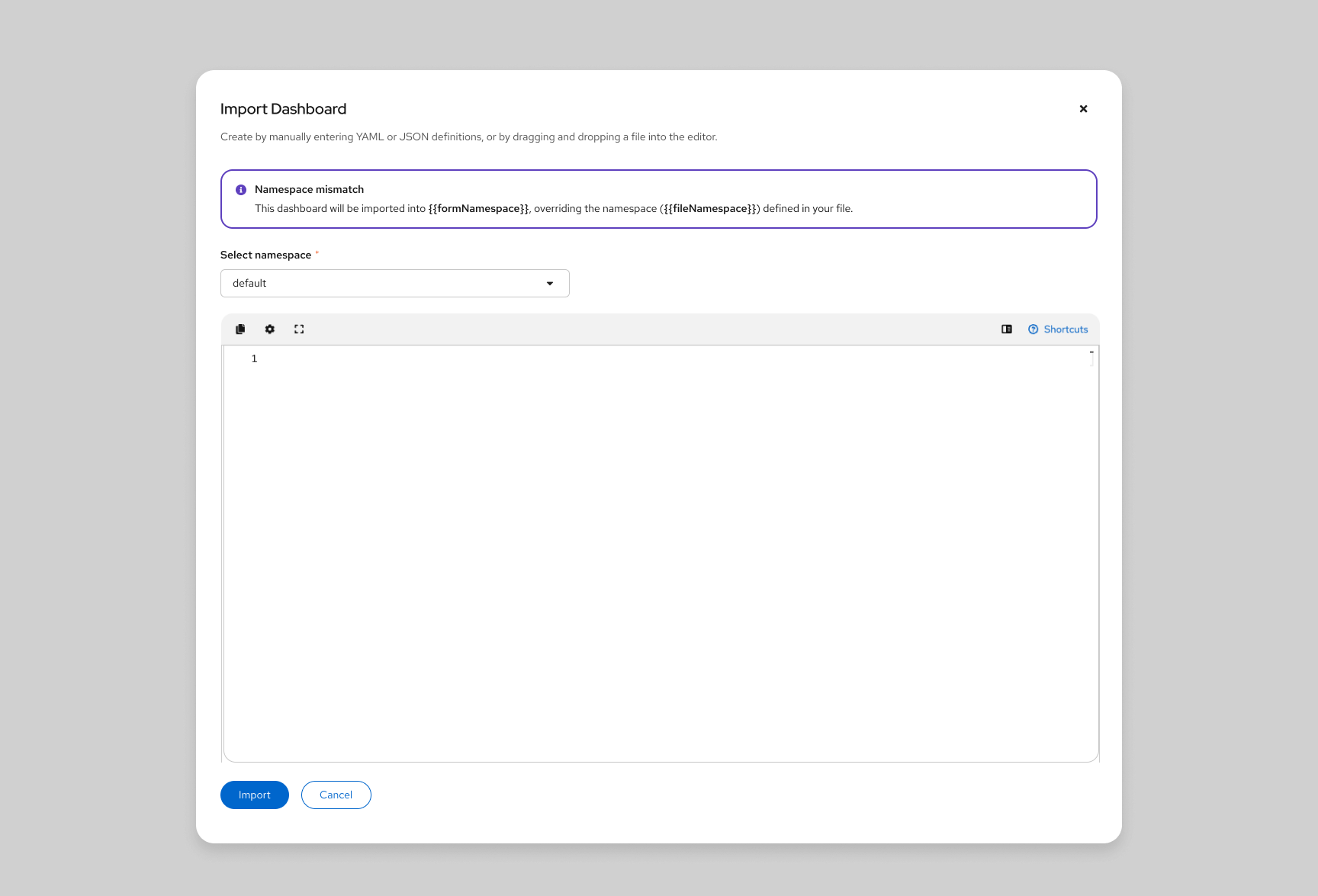 - The popup should contain a namespace selector. When clicking on "OK" the dashboard should be imported on the selected namespace.