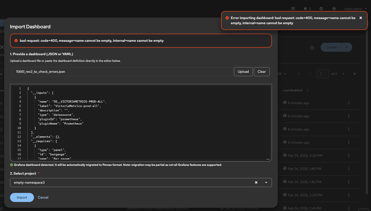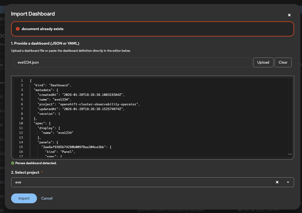 - When clicking on import, the dashboard should be created in the target namespace/project