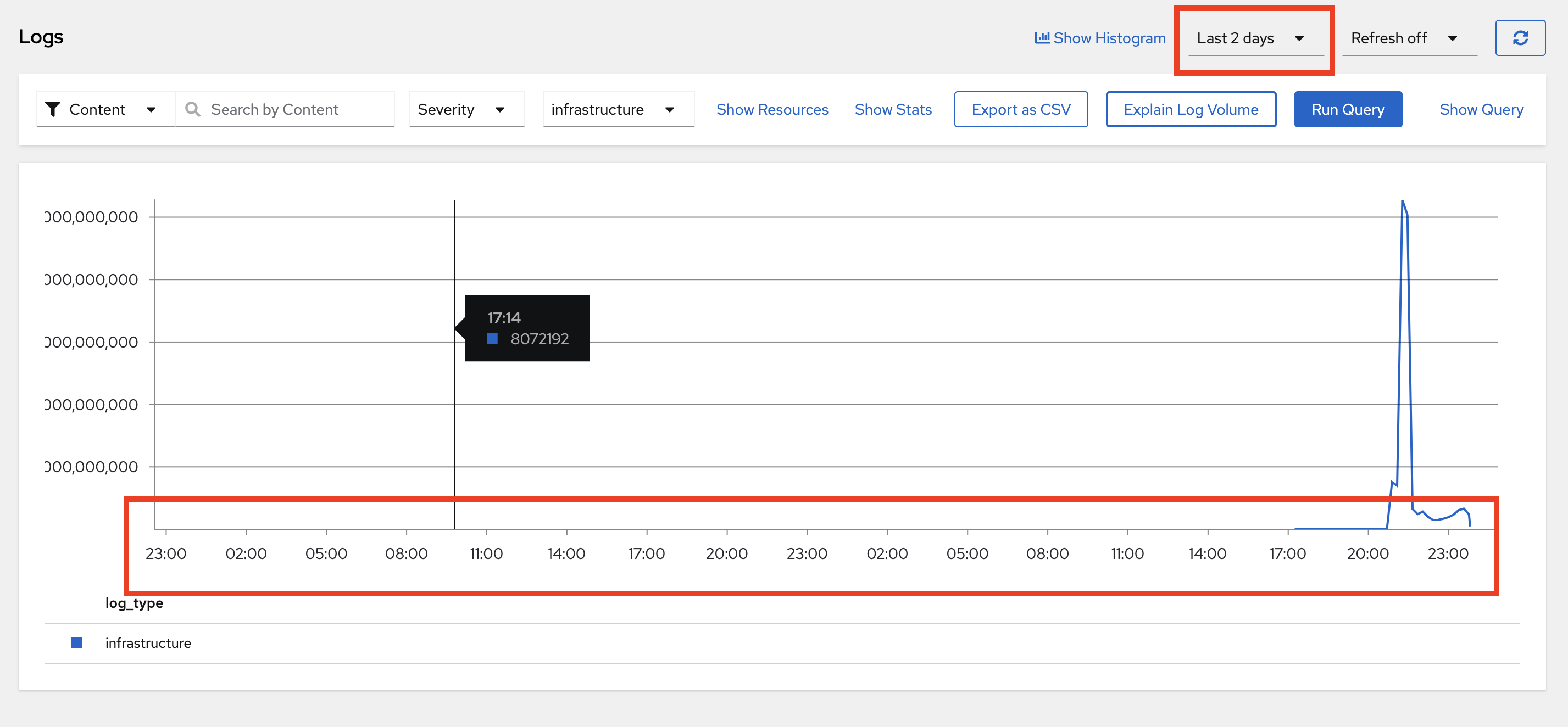 When checking the log volume in "Observe > Logs" provisioned using Logging UIPlugin, and selecting Explain Log Volume option for time duration more than 1 day, then the date is not available on x-axis because of which it is hard to identify, to which instant the metric is pointing the value to.