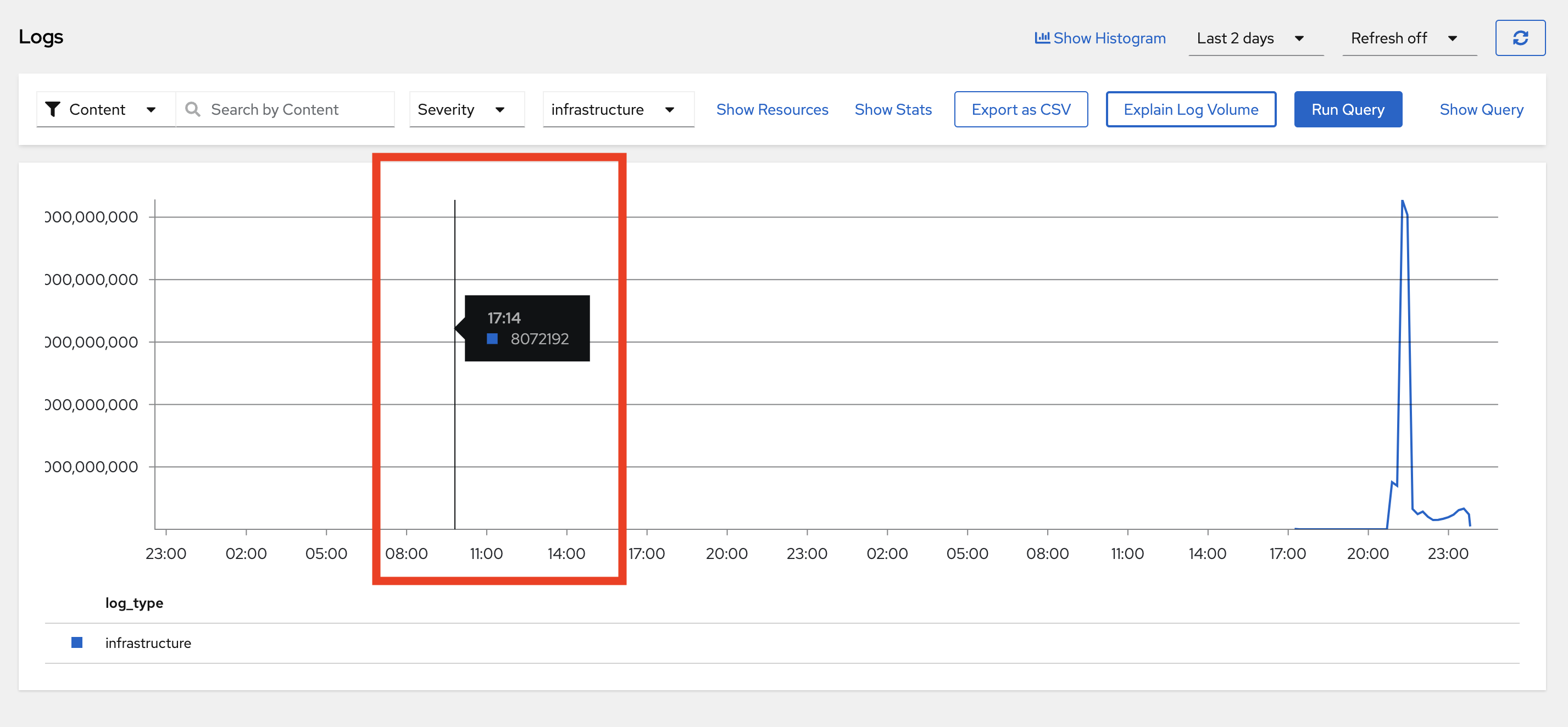 4. Click on Explain Log Volume option and hover over graph and see the time that it shows is wrong. Refer attached snippet.