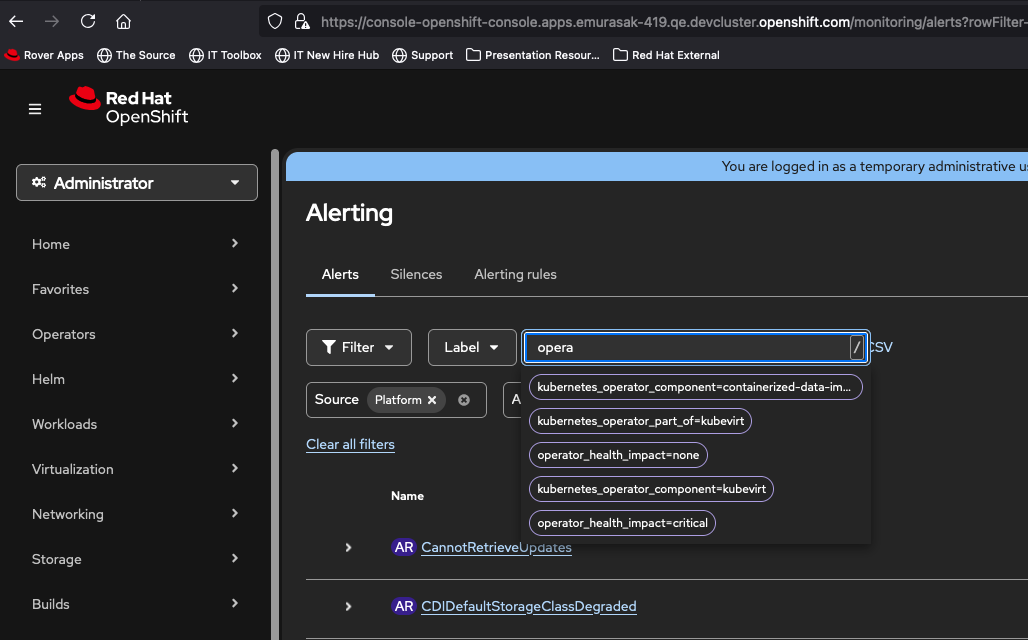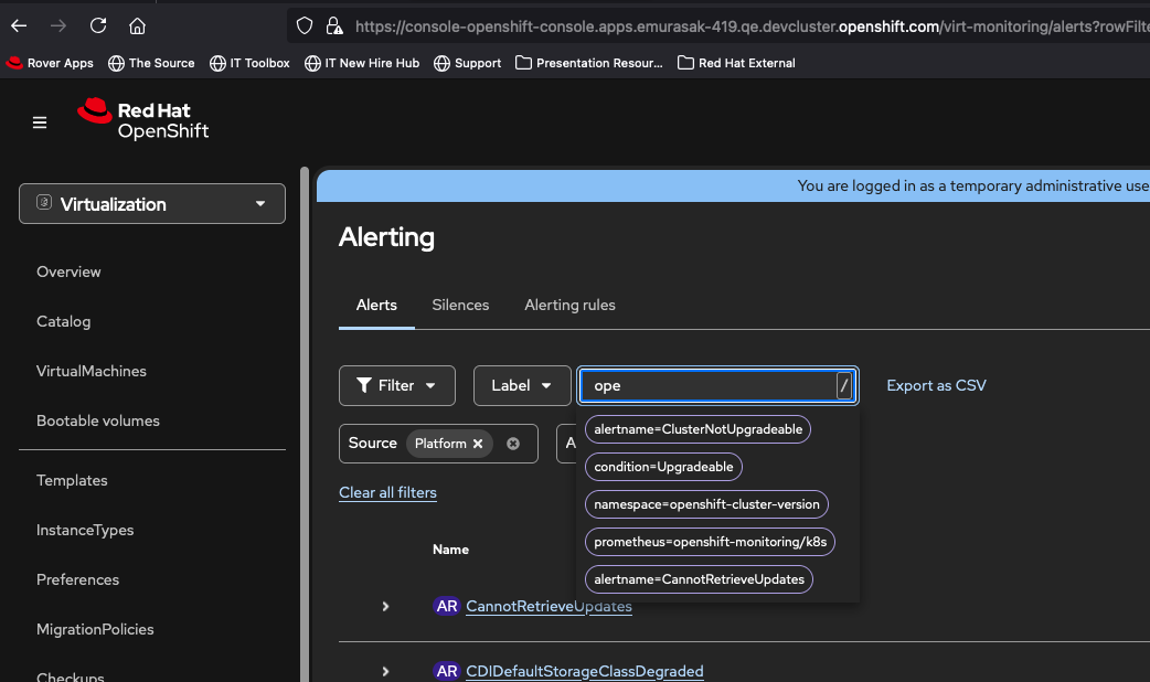- in Admin perspective, Virtualization > Overview > scroll down and check Alerts section