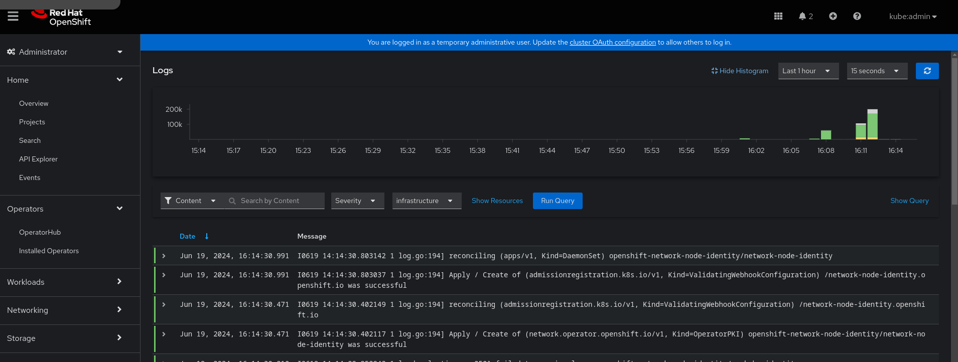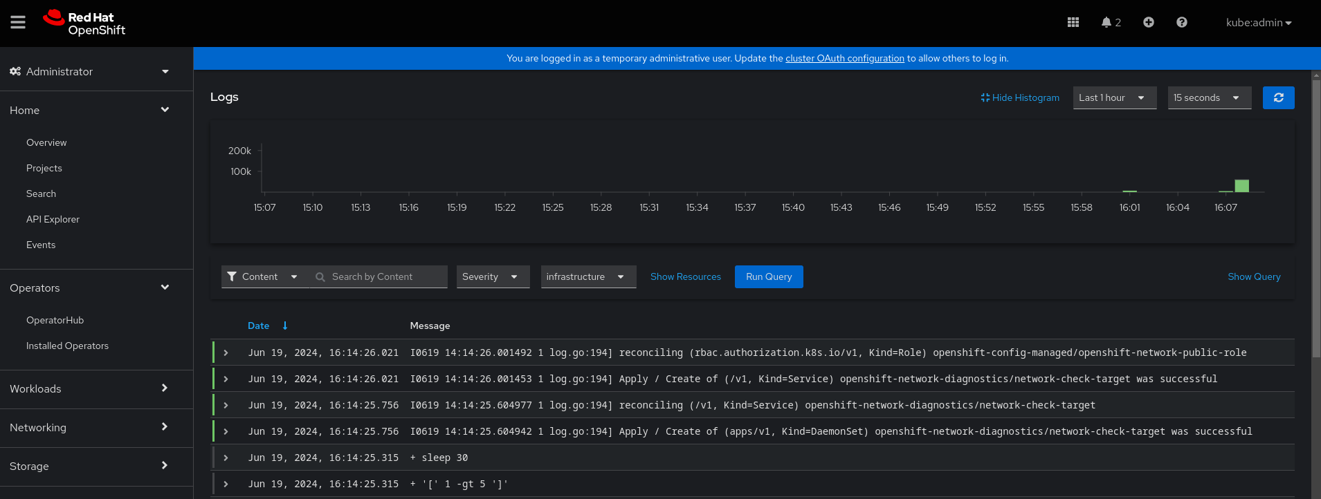 - Navigate to "Observe" -> "Logs" and show the "infrastructure" logs