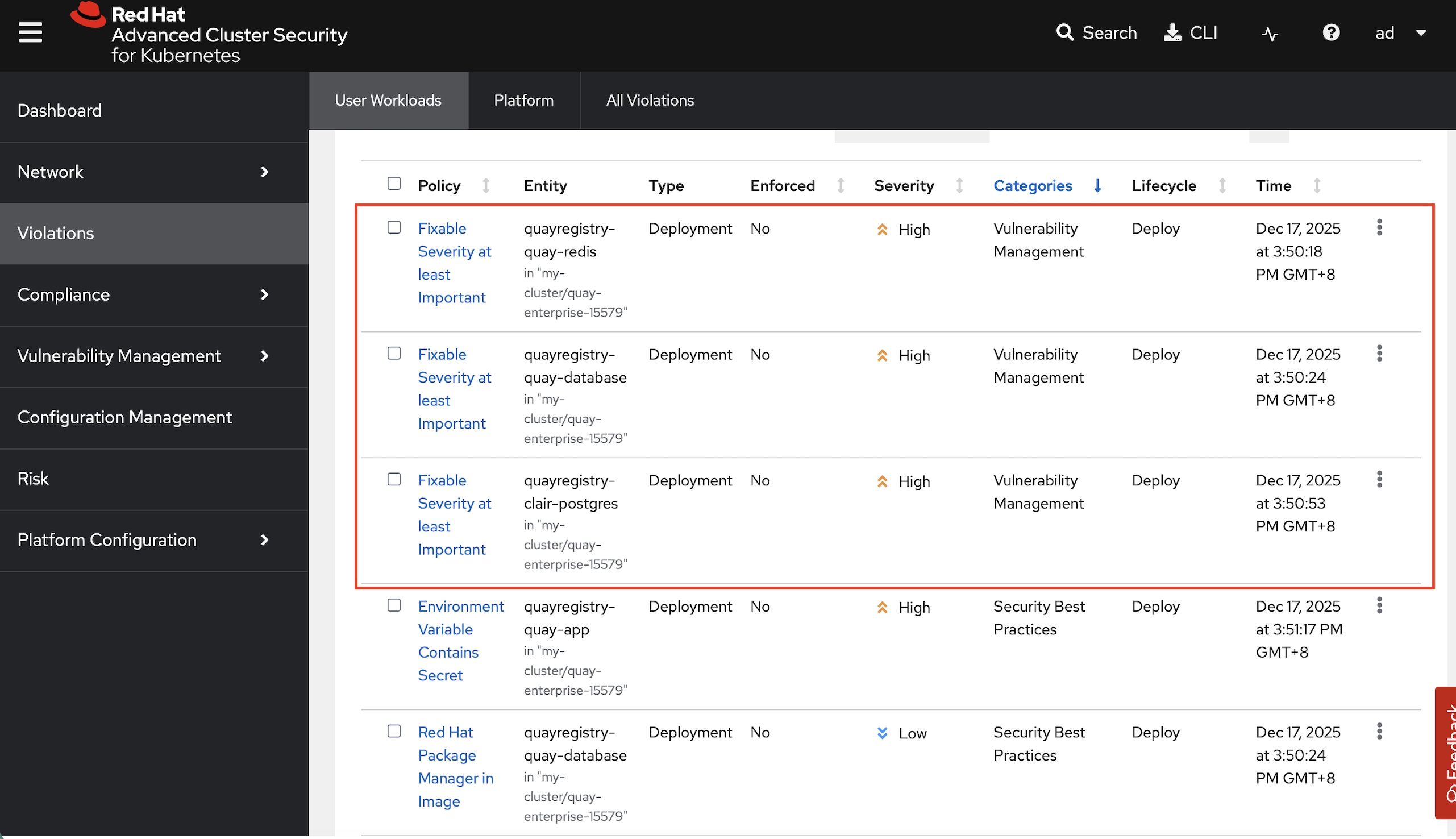 This is an issue found in Quay 3.14.6, after deployed Quay 3.14.6 with Quay Operator, found Redhat ACS reported HIGH Image Vulnerability of Quay Postgres Database, Clair Postgres Database and Redis, pls review this issue.
