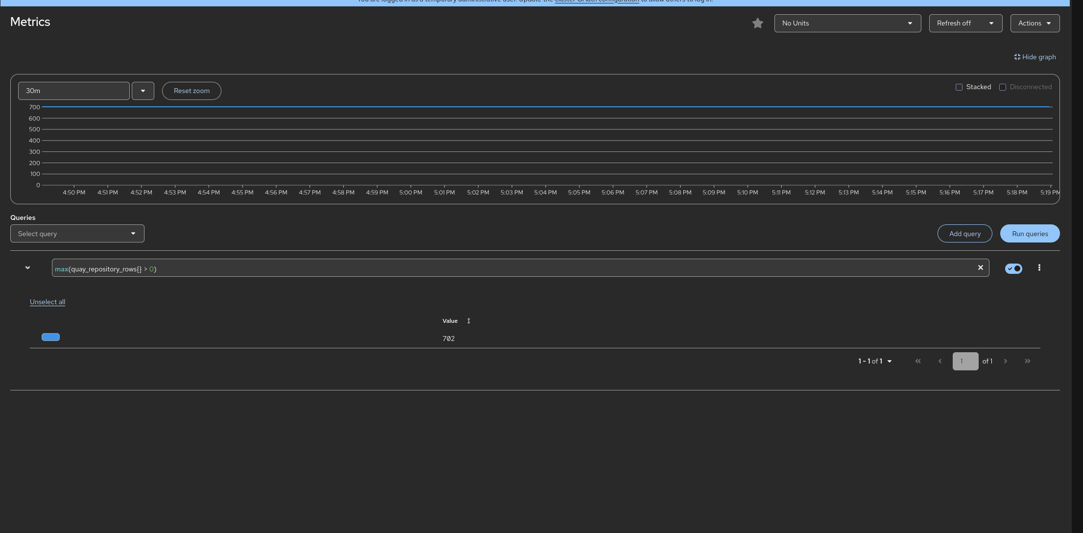 quay_repository_rows{host="quayregistry-quay-app-6b5b5d7b5-dbxvn",instance="",job="quay",pid="69",process_name="globalpromstats.py"} 1