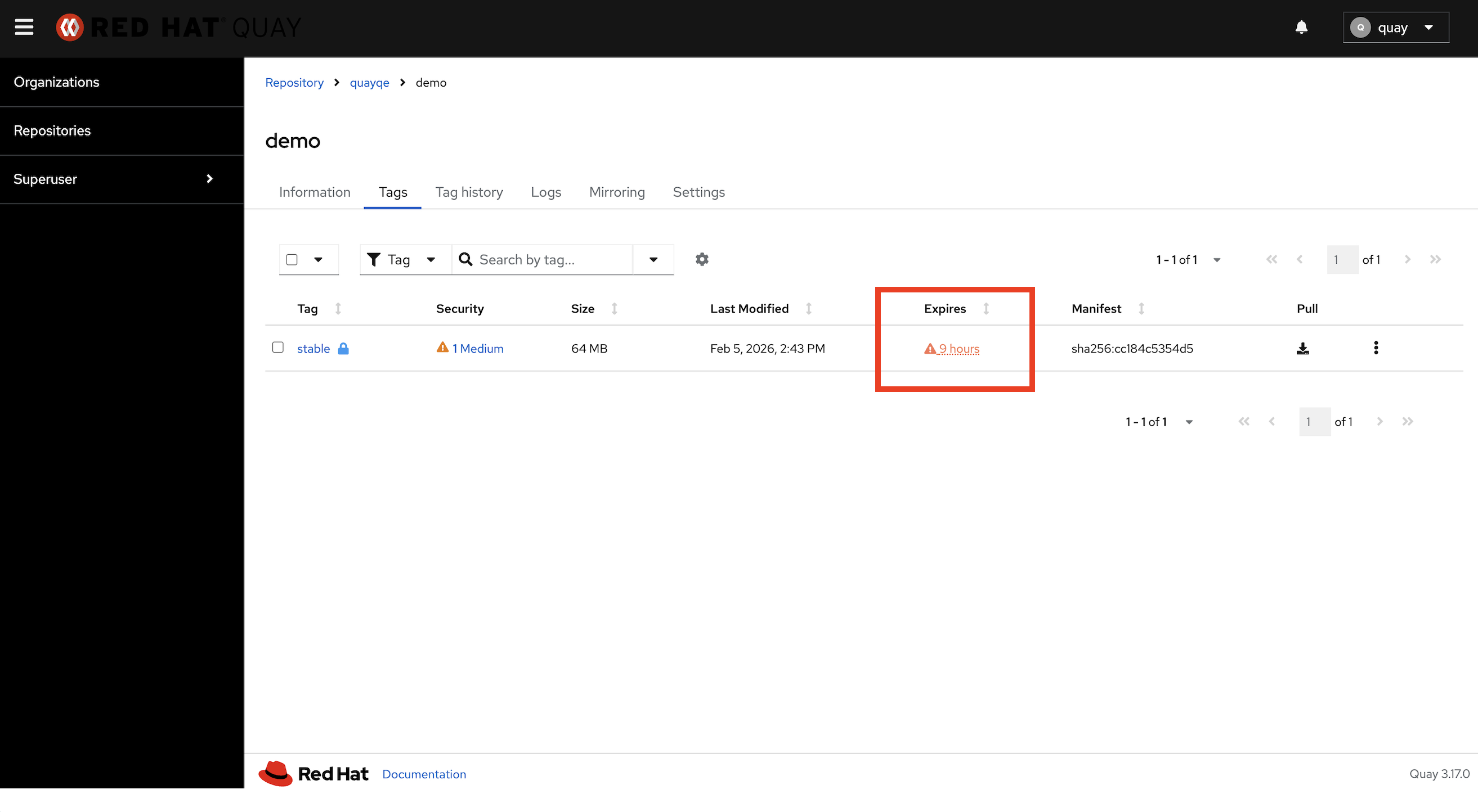 - Call API: PUT /api/v1/repository/test/demo/tag/v1.0.0 with "expiration": 1739000000